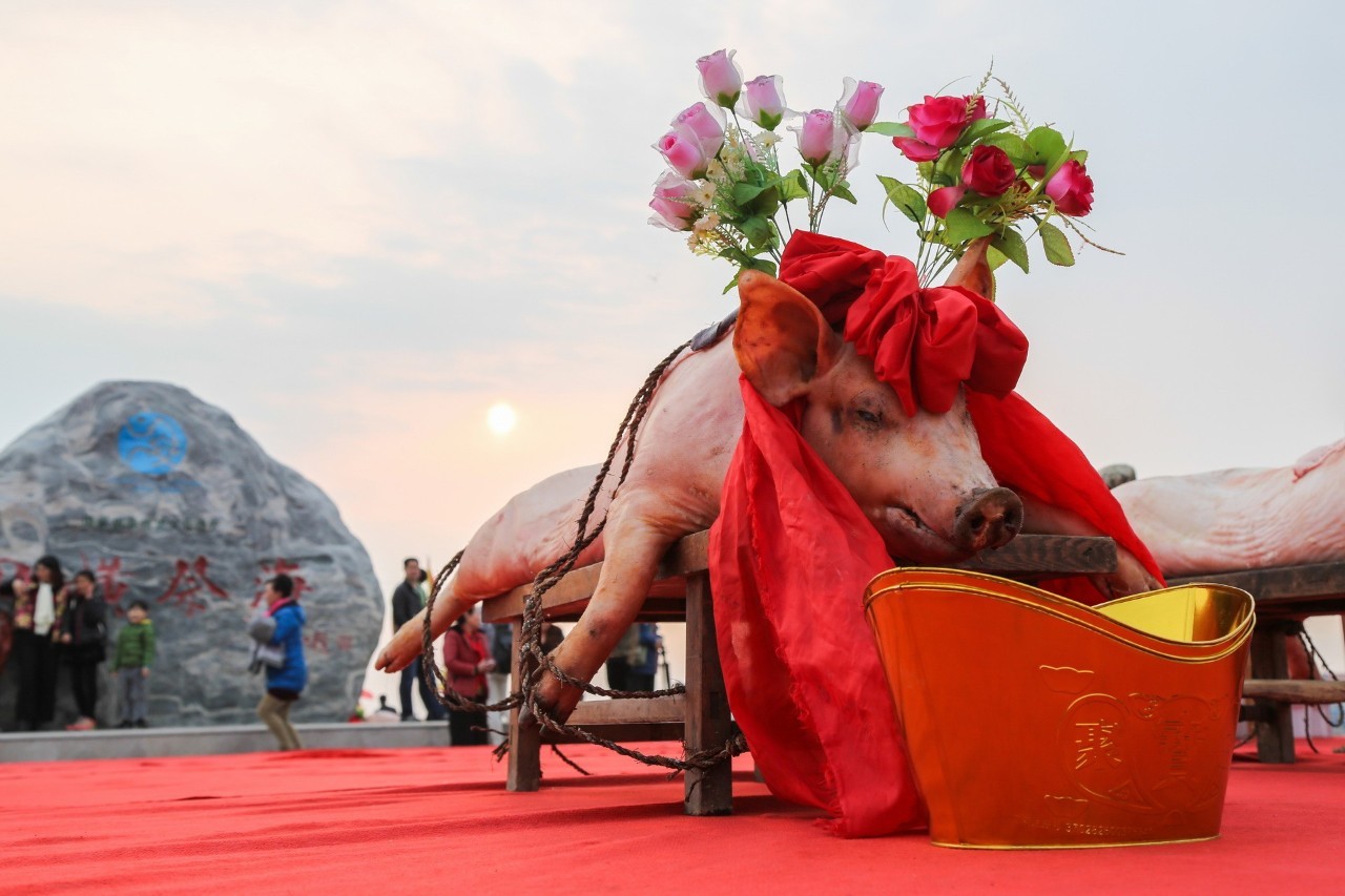 再是選三牲:豬、雞、魚(yú)。豬以黑毛公豬為佳,越大越好,宰殺后刮毛,只留豬脖上一撮黑毛,并用紅綢布打結(jié)而成的紅花帶披掛在豬頭和豬脖子上。雞要選個(gè)頭大的紅公雞,魚(yú)要用大個(gè)的鱸魚(yú)。