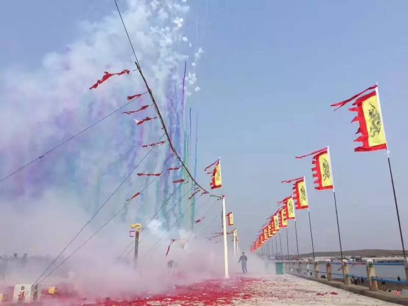 上千掛鞭炮在海灘邊一字排開(kāi),良辰吉時(shí)一到,鞭炮齊鳴、鑼鼓喧天。