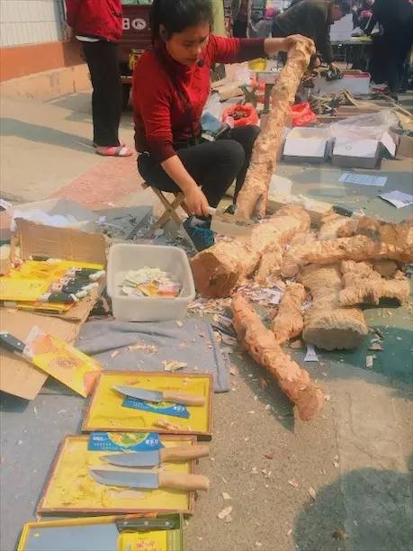 大姐在賣(mài)刀,大個(gè)的木頭做道具,讓人們看看這刀的鋒利。