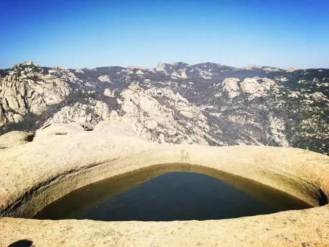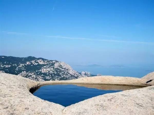 天心池,是嶗山東麓日起石峰頂上一個心形水池,在山頂自然形成,面積有兩張乒乓球桌大小,池底水深近兩米,常年不涸,秀美異常!