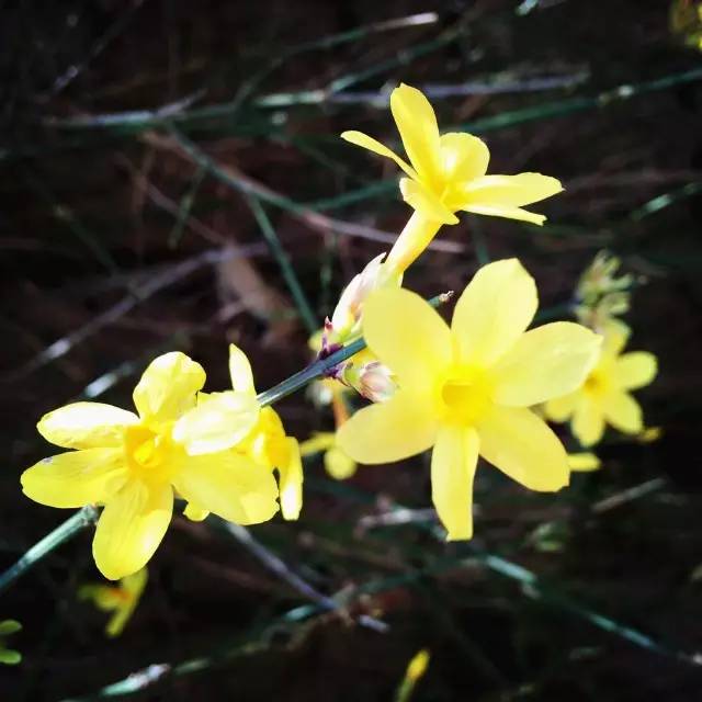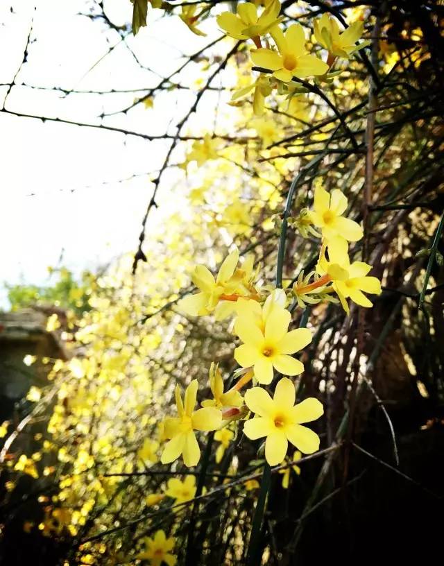 近日正值迎春花期,在陽光下,滿眼金燦,煞是好看。