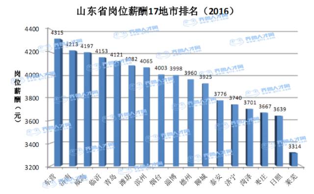 ????2016年山東17地市的崗位月薪排名,東營以4315元獨占鰲頭,濟南、威海、臨沂、青島、濰坊、濱州、煙臺、淄博、德州、聊城排在第二陣營,泰安、濟寧、菏澤、棗莊、日照排在第三陣營。青島以4121元排名第五,萊蕪以3314元排在最后,而且與第三陣營差距較大。