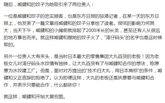 灣仔碼頭發(fā)展至今,不僅是國內(nèi)最受歡迎的冷凍食品品牌之一,也已成為出口國外市場的知名品牌,每年銷售額超過60億,而臧健和也成為身價50億的女強人,被人們譽為“水餃皇后”。