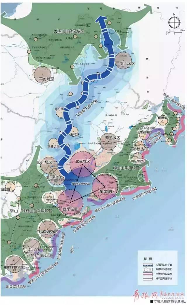 ????針對全域風(fēng)貌結(jié)構(gòu),建立以大沽河生態(tài)景觀中軸為串聯(lián),以“大澤山山系風(fēng)貌區(qū)、珠山—鐵橛山山系風(fēng)貌區(qū)、嶗山山系風(fēng)貌區(qū)”為核心,膠州灣、鰲山灣、靈山灣三大灣群為支撐的“一軸、三核、三灣”的全域山水景觀風(fēng)貌骨架,加強結(jié)構(gòu)性山水景觀資源的整體保護。