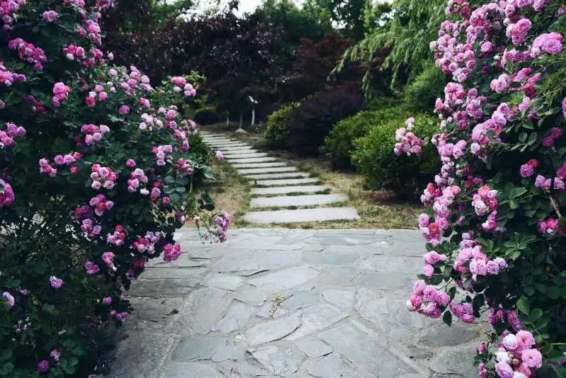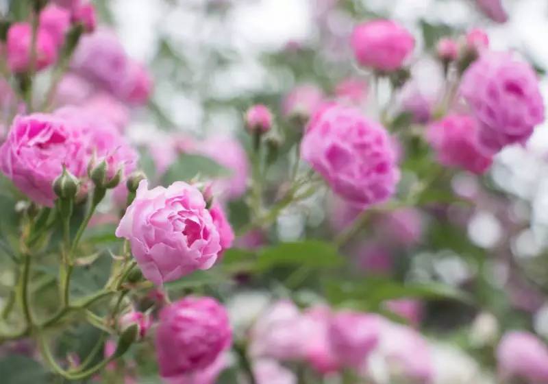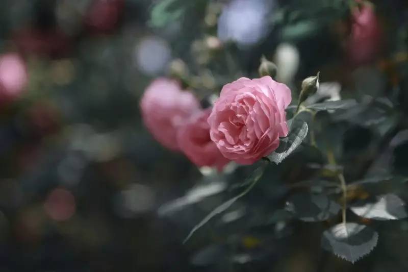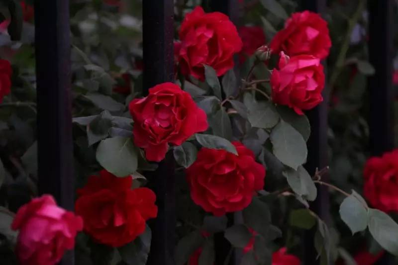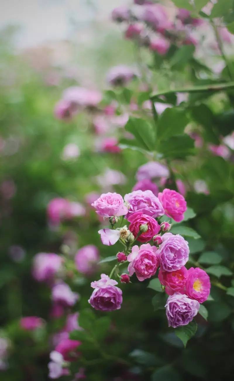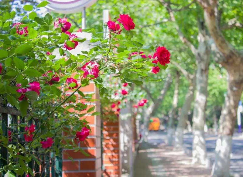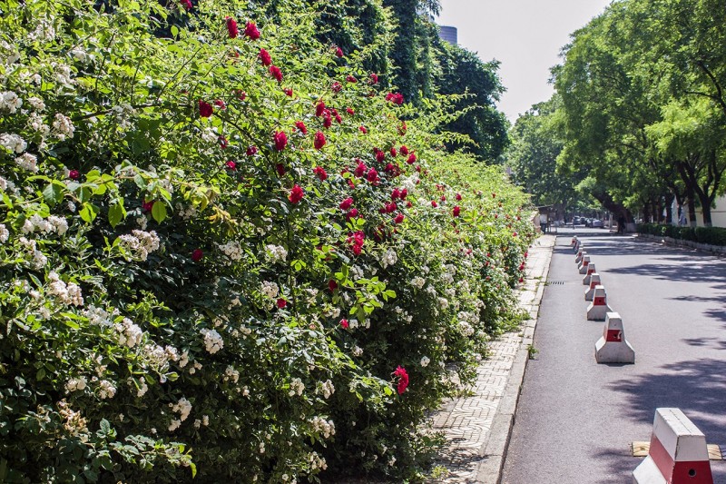 一叢叢、一簇簇的薔薇花,盛開在仿若絲絨一般格外綠格外厚的葉墻上,遠遠望去猶如艷麗奪目的錦緞。熠熠生輝、分外美麗,一派欣欣向榮之景。