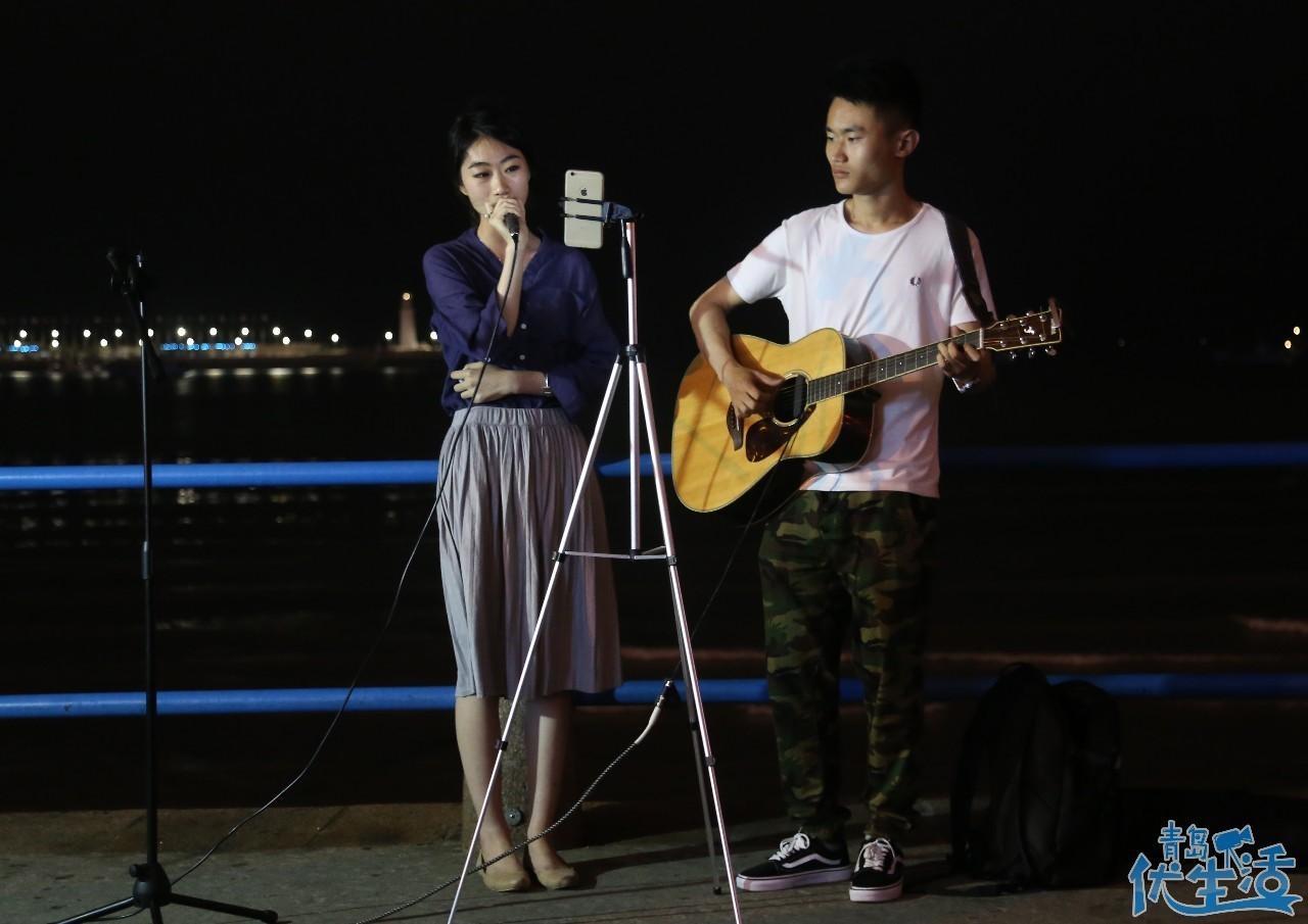 這里的夜晚有歌聲,十塊錢一首,你來唱歌,我為你伴奏。去唱歌的人多數(shù)歌唱算不上好聽,或者走調(diào),但是唱的人開心,圍觀的人也會在曲終鼓掌。讓五四廣場的夜晚更是浪漫。