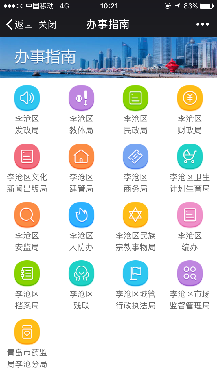 關注微信公眾號“李滄區(qū)政務服務大廳”后,點擊“微大廳”進入大廳首頁,行政審批大廳簡介、辦件統(tǒng)計、叫號查詢、辦事部門、事項辦理情況幾個板塊在簡潔的頁面上清晰明了。據(jù)了解,目前網(wǎng)上大廳共入駐了區(qū)市場監(jiān)管局、區(qū)城管局、區(qū)商務局、區(qū)食藥監(jiān)局等17個職能部門,辦事居民可在此對應相關業(yè)務進行辦事指南查看、網(wǎng)上預約和快遞查詢等操作。