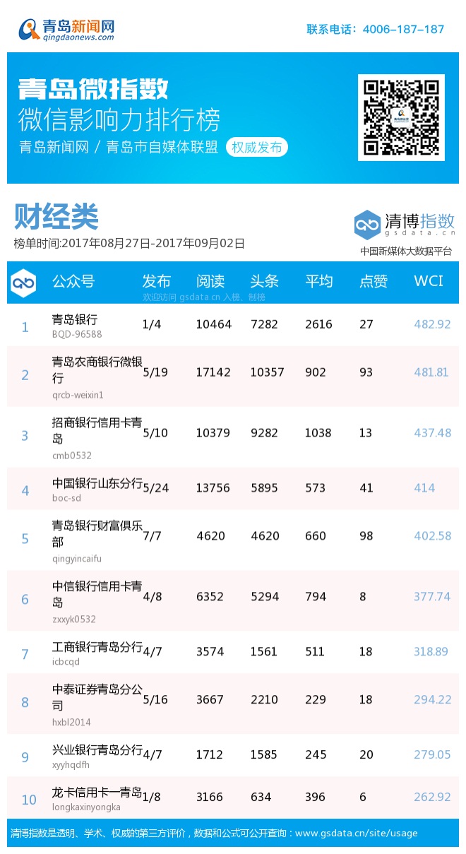 由青島新聞網(wǎng)聯(lián)合清博指數(shù)平臺聯(lián)手打造的“青島微指數(shù)微信影響力排行榜”,通過對各行業(yè)微信公眾號的日常監(jiān)測,對所有賬號在統(tǒng)計周期內(nèi)所發(fā)布內(nèi)容的發(fā)文總數(shù)、總閱讀數(shù)、頭條閱讀數(shù)、平均閱讀數(shù)及總點贊數(shù)等海量數(shù)據(jù)進(jìn)行分析,幫助各行業(yè)新媒體小編更好地運營微信。