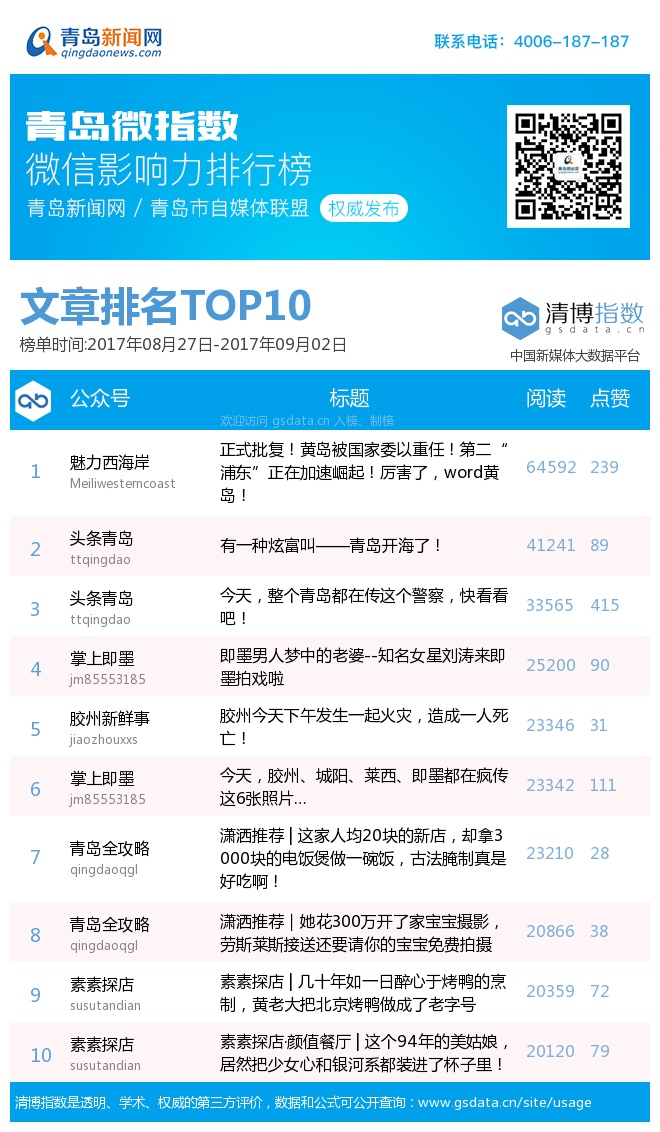 由青島新聞網(wǎng)聯(lián)合清博指數(shù)平臺聯(lián)手打造的“青島微指數(shù)微信影響力排行榜”,通過對各行業(yè)微信公眾號的日常監(jiān)測,對所有賬號在統(tǒng)計周期內(nèi)所發(fā)布內(nèi)容的發(fā)文總數(shù)、總閱讀數(shù)、頭條閱讀數(shù)、平均閱讀數(shù)及總點贊數(shù)等海量數(shù)據(jù)進行分析,幫助各行業(yè)新媒體小編更好地運營微信。