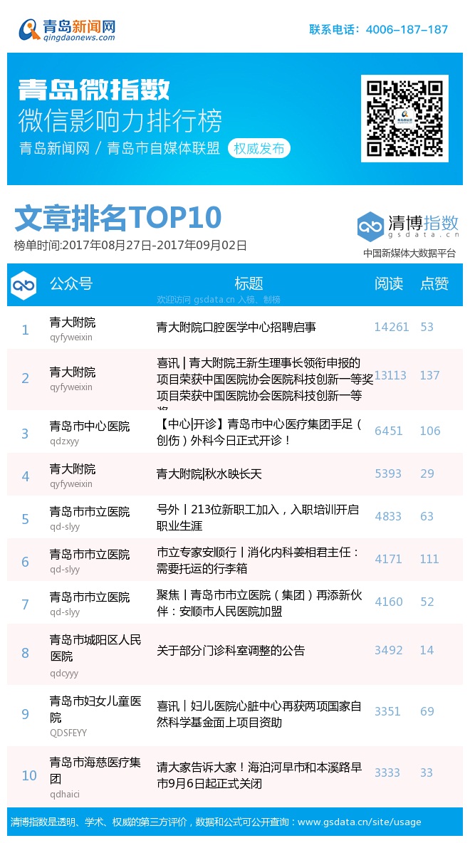 由青島新聞網(wǎng)聯(lián)合清博指數(shù)平臺聯(lián)手打造的“青島微指數(shù)微信影響力排行榜”,通過對各行業(yè)微信公眾號的日常監(jiān)測,對所有賬號在統(tǒng)計(jì)周期內(nèi)所發(fā)布內(nèi)容的發(fā)文總數(shù)、總閱讀數(shù)、頭條閱讀數(shù)、平均閱讀數(shù)及總點(diǎn)贊數(shù)等海量數(shù)據(jù)進(jìn)行分析,幫助各行業(yè)新媒體小編更好地運(yùn)營微信。