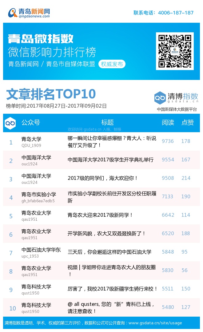 由青島新聞網(wǎng)聯(lián)合清博指數(shù)平臺聯(lián)手打造的“青島微指數(shù)微信影響力排行榜”,通過對各行業(yè)微信公眾號的日常監(jiān)測,對所有賬號在統(tǒng)計周期內(nèi)所發(fā)布內(nèi)容的發(fā)文總數(shù)、總閱讀數(shù)、頭條閱讀數(shù)、平均閱讀數(shù)及總點贊數(shù)等海量數(shù)據(jù)進(jìn)行分析,幫助各行業(yè)新媒體小編更好地運營微信。