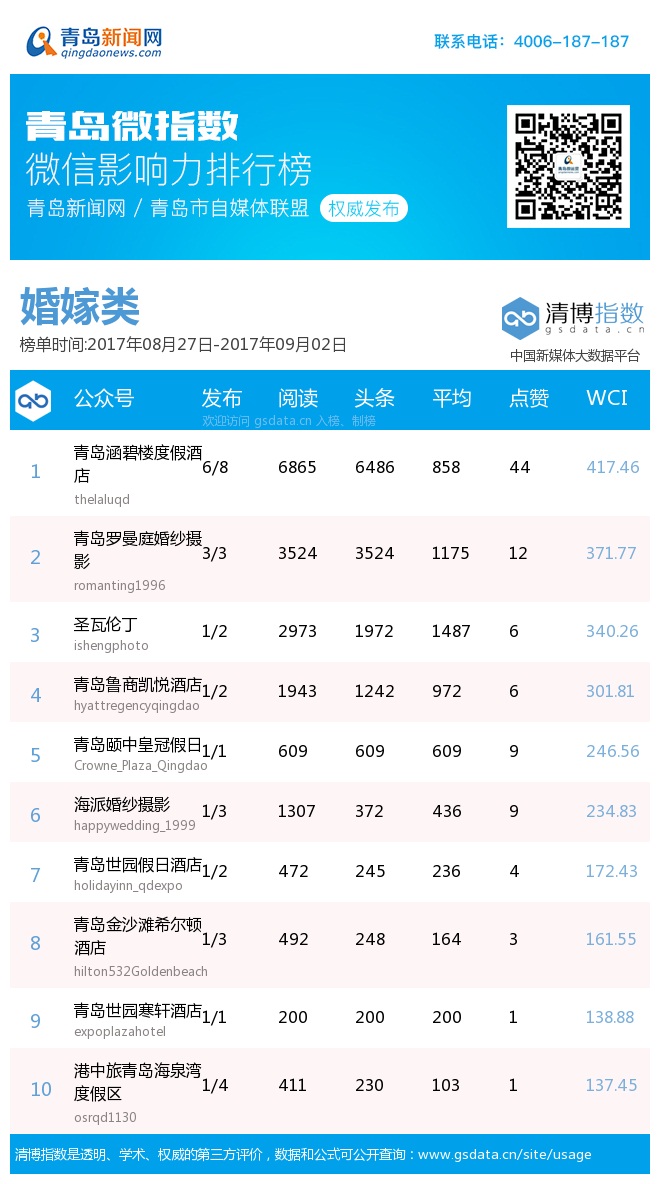 由青島新聞網(wǎng)聯(lián)合清博指數(shù)平臺(tái)聯(lián)手打造的“青島微指數(shù)微信影響力排行榜”,通過(guò)對(duì)各行業(yè)微信公眾號(hào)的日常監(jiān)測(cè),對(duì)所有賬號(hào)在統(tǒng)計(jì)周期內(nèi)所發(fā)布內(nèi)容的發(fā)文總數(shù)、總閱讀數(shù)、頭條閱讀數(shù)、平均閱讀數(shù)及總點(diǎn)贊數(shù)等海量數(shù)據(jù)進(jìn)行分析,幫助各行業(yè)新媒體小編更好地運(yùn)營(yíng)微信。