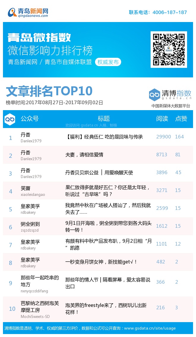 由青島新聞網(wǎng)聯(lián)合清博指數(shù)平臺聯(lián)手打造的“青島微指數(shù)微信影響力排行榜”,通過對各行業(yè)微信公眾號的日常監(jiān)測,對所有賬號在統(tǒng)計周期內(nèi)所發(fā)布內(nèi)容的發(fā)文總數(shù)、總閱讀數(shù)、頭條閱讀數(shù)、平均閱讀數(shù)及總點贊數(shù)等海量數(shù)據(jù)進行分析,幫助各行業(yè)新媒體小編更好地運營微信。