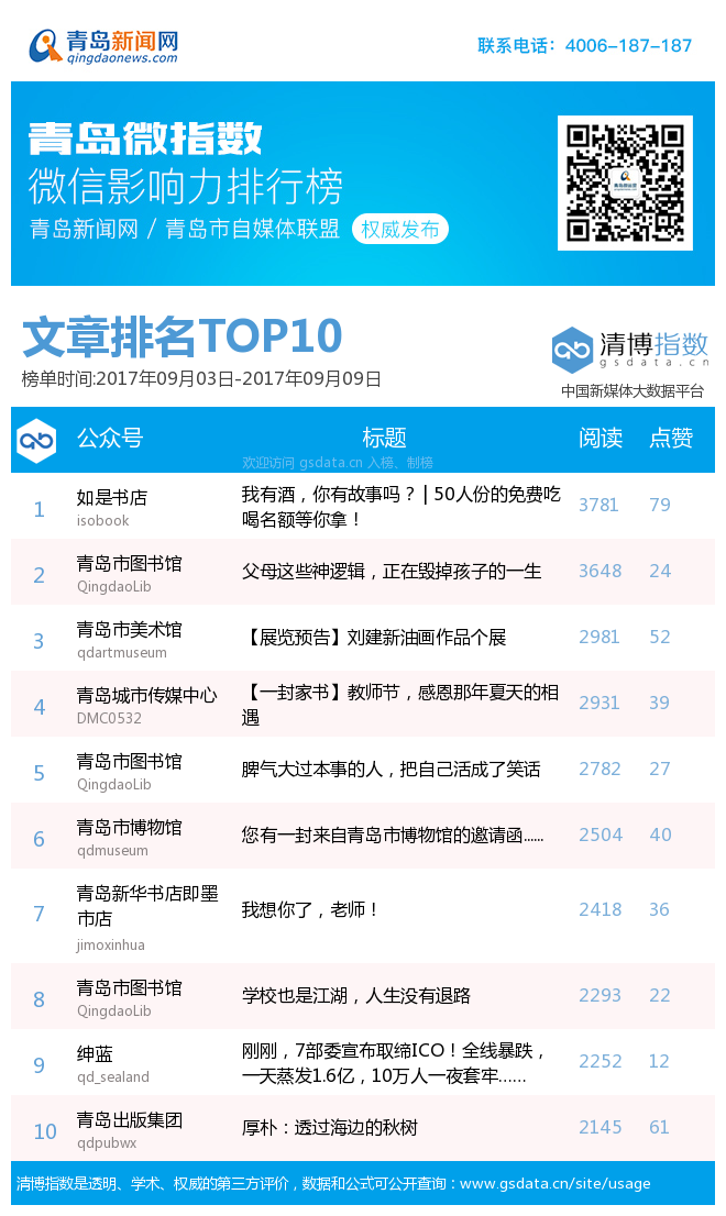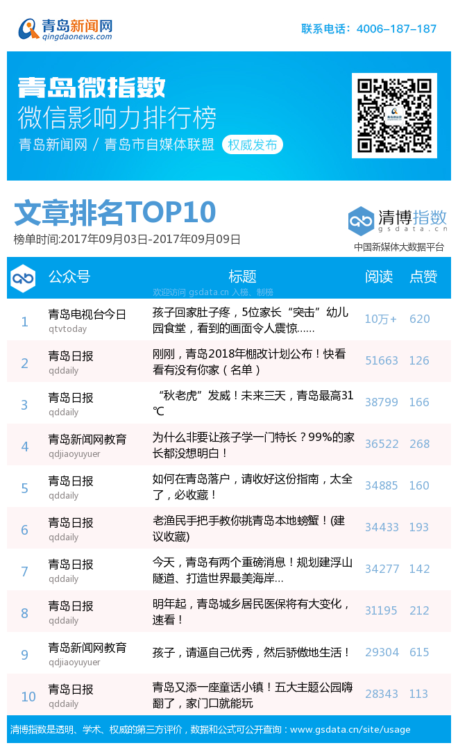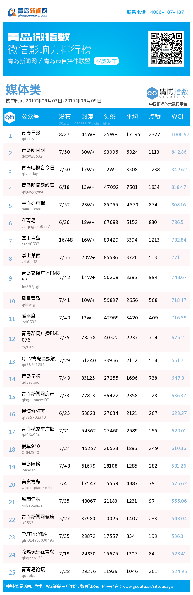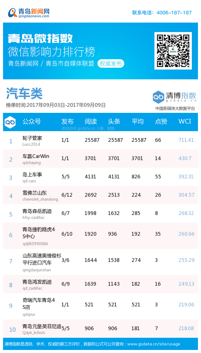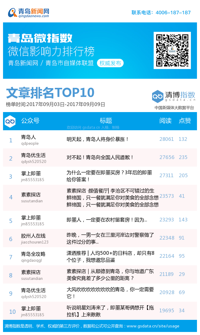 由青島新聞網(wǎng)聯(lián)合清博指數(shù)平臺聯(lián)手打造的“青島微指數(shù)微信影響力排行榜”,通過對各行業(yè)微信公眾號的日常監(jiān)測,對所有賬號在統(tǒng)計(jì)周期內(nèi)所發(fā)布內(nèi)容的發(fā)文總數(shù)、總閱讀數(shù)、頭條閱讀數(shù)、平均閱讀數(shù)及總點(diǎn)贊數(shù)等海量數(shù)據(jù)進(jìn)行分析,幫助各行業(yè)新媒體小編更好地運(yùn)營微信。