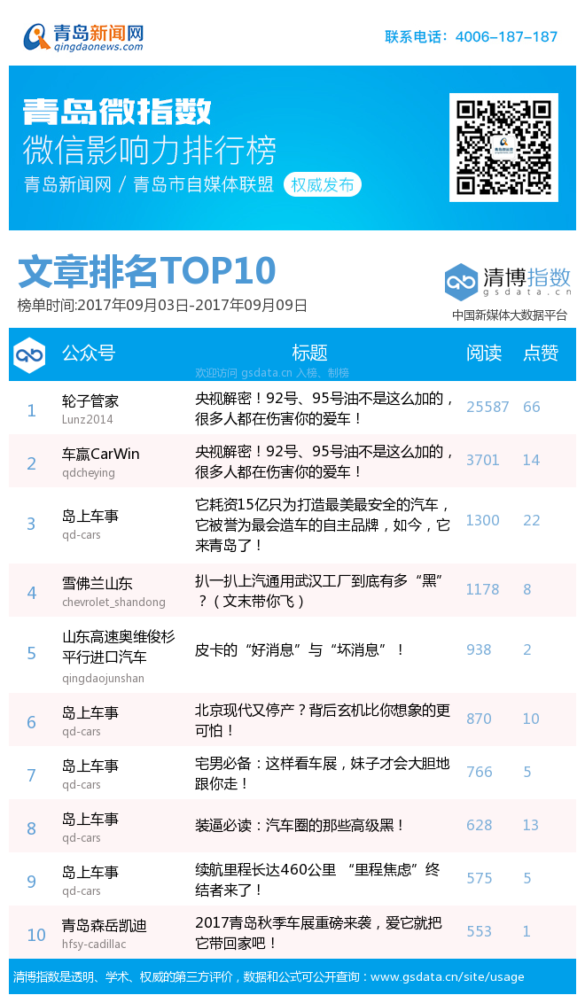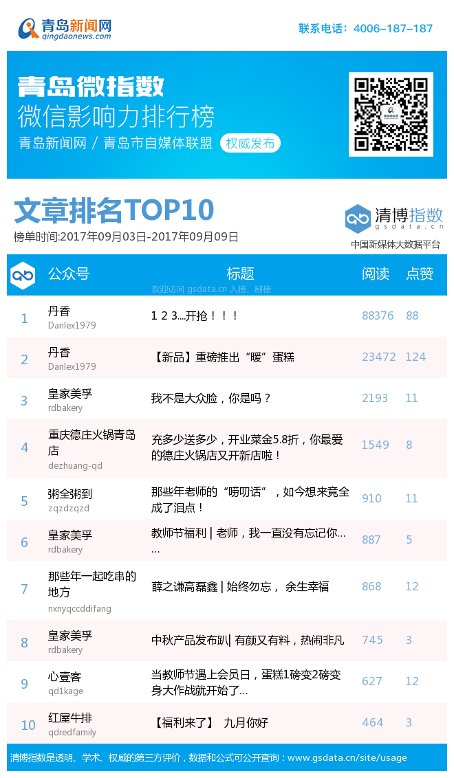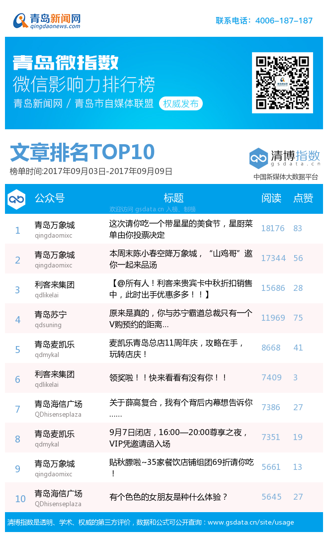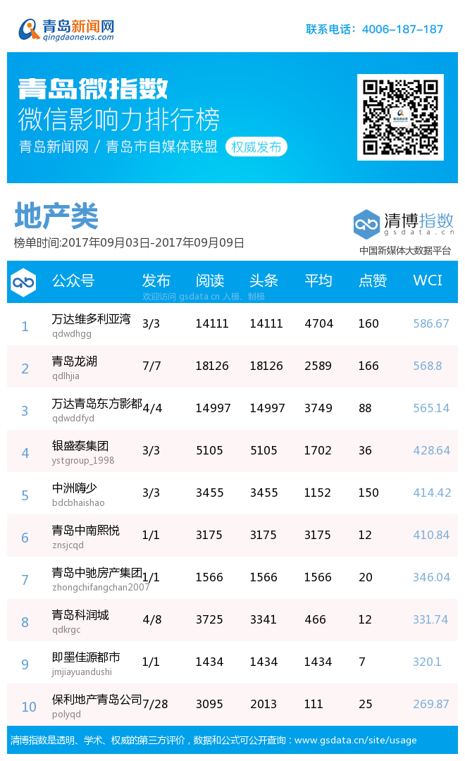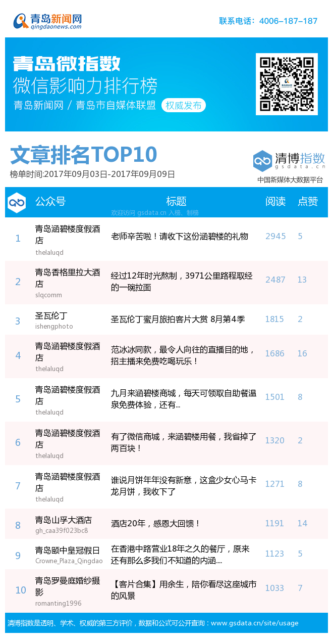 由青島新聞網(wǎng)聯(lián)合清博指數(shù)平臺聯(lián)手打造的“青島微指數(shù)微信影響力排行榜”,通過對各行業(yè)微信公眾號的日常監(jiān)測,對所有賬號在統(tǒng)計(jì)周期內(nèi)所發(fā)布內(nèi)容的發(fā)文總數(shù)、總閱讀數(shù)、頭條閱讀數(shù)、平均閱讀數(shù)及總點(diǎn)贊數(shù)等海量數(shù)據(jù)進(jìn)行分析,幫助各行業(yè)新媒體小編更好地運(yùn)營微信。