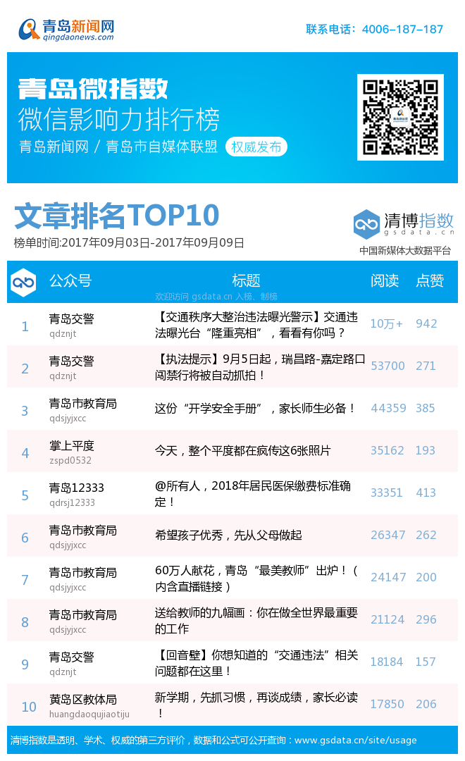 本期政務(wù)類榜單中,“沉睡”了一周的“青島交警”蘇醒,并亮出了重要法寶——交通違法曝光臺,受到島城車主的強(qiáng)烈關(guān)注,其發(fā)布的“【交通秩序大整治違法曝光警示】交通違法曝光臺“隆重亮相”,看看有你嗎?”一文更是取得了閱讀10萬+,點(diǎn)贊942次的成績,在政務(wù)類排名中遙遙領(lǐng)先,最終以969.33的WCI指數(shù)穩(wěn)穩(wěn)拿下榜首。
