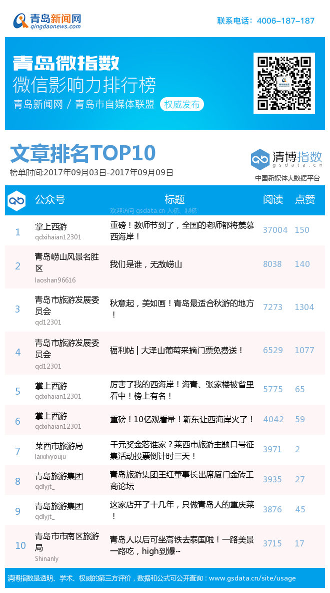 旅游類榜單中,“掌上西游”打破“青島市旅游發(fā)展委員會”一連幾期壟斷榜首的局面,憑借一篇“重磅!教師節(jié)到了,全國的老師都將羨慕西海岸!”教師節(jié)福利推文一舉奪得本期旅游類榜首,該文章更是得到了青島教師們的一致歡迎,截至目前閱讀37187次,點(diǎn)贊150次,可謂是一次成功的教師節(jié)活動策劃。