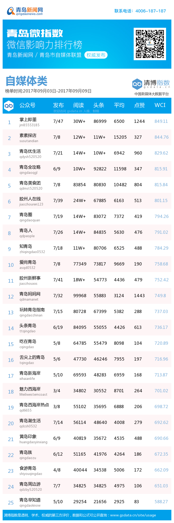自媒體類榜單中,“掌上即墨”由上周第6名躍居本期第1名。該公號在統(tǒng)計(jì)期間共發(fā)布文章47篇,閱讀總數(shù)30W+,點(diǎn)贊總數(shù)1244,WCI指數(shù)849.11,不論是文章發(fā)布數(shù)、總閱讀數(shù)、還是WCI指數(shù),都高居自媒體類榜首。