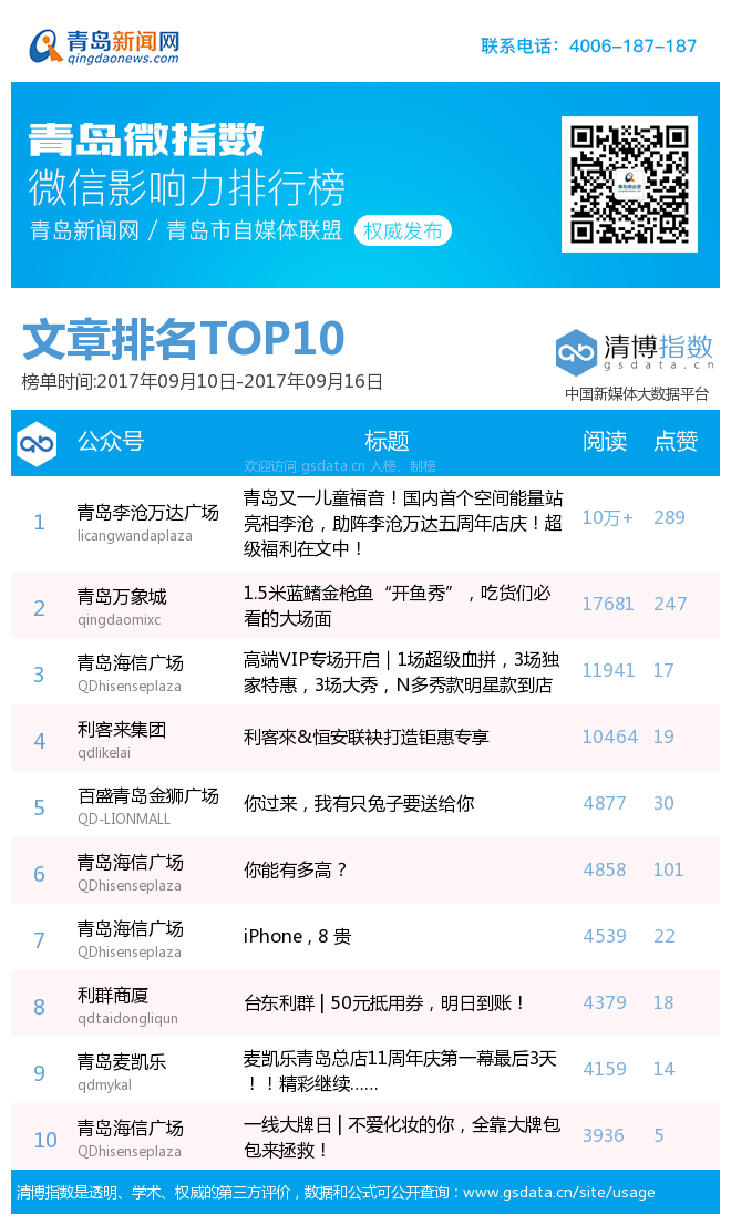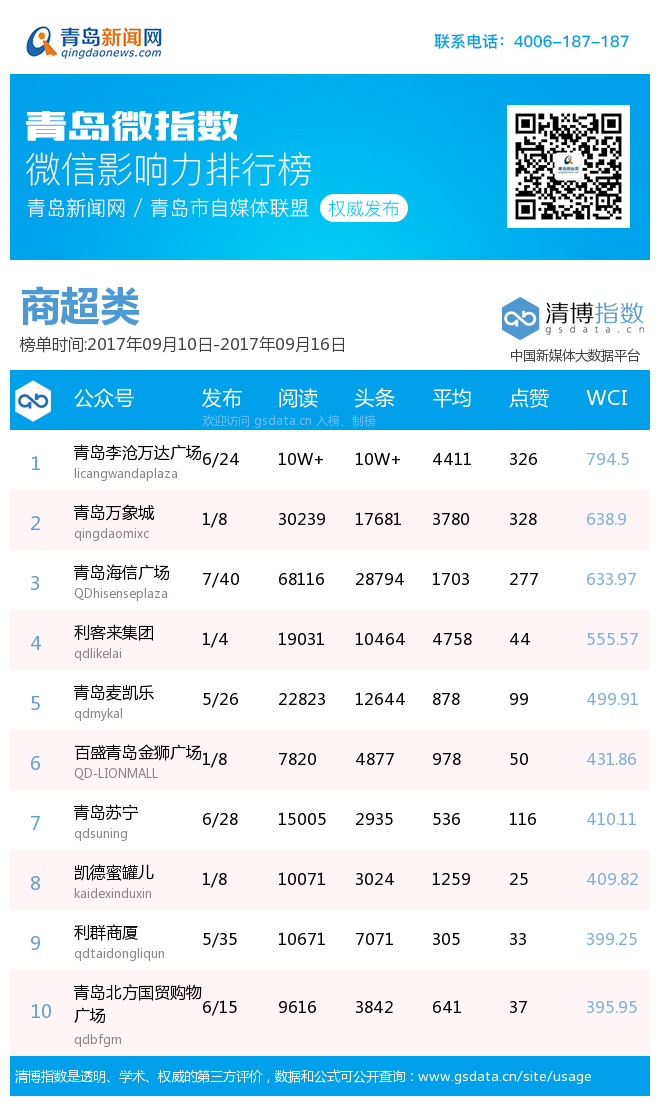由青島新聞網(wǎng)聯(lián)合清博指數(shù)平臺聯(lián)手打造的“青島微指數(shù)微信影響力排行榜”,通過對各行業(yè)微信公眾號的日常監(jiān)測,對所有賬號在統(tǒng)計周期內(nèi)所發(fā)布內(nèi)容的發(fā)文總數(shù)、總閱讀數(shù)、頭條閱讀數(shù)、平均閱讀數(shù)及總點贊數(shù)等海量數(shù)據(jù)進行分析,幫助各行業(yè)新媒體小編更好地運營微信。