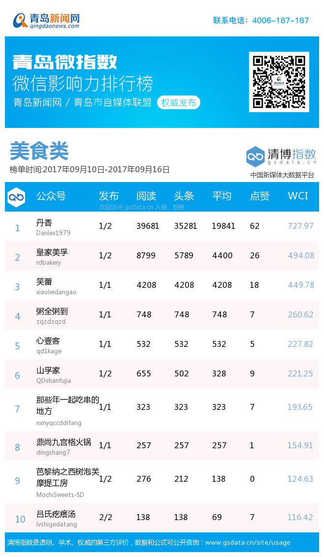 由青島新聞網(wǎng)聯(lián)合清博指數(shù)平臺聯(lián)手打造的“青島微指數(shù)微信影響力排行榜”,通過對各行業(yè)微信公眾號的日常監(jiān)測,對所有賬號在統(tǒng)計周期內(nèi)所發(fā)布內(nèi)容的發(fā)文總數(shù)、總閱讀數(shù)、頭條閱讀數(shù)、平均閱讀數(shù)及總點贊數(shù)等海量數(shù)據(jù)進行分析,幫助各行業(yè)新媒體小編更好地運營微信。