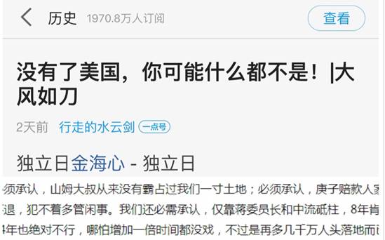 ????一點號“行走的水云劍”發(fā)布文章《沒有了美國,你可能什么都不是》。文章否認了中國共產黨在抗日戰(zhàn)爭中的中流砥柱作用,將抗日戰(zhàn)爭的勝利歸因于美國的介入,歪曲歷史、顛倒是非,嚴重背離社會主義核心價值觀。