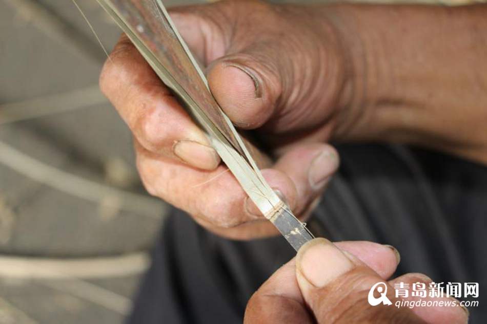 青島新聞網(wǎng)記者在現(xiàn)場看到,王成堂用刀將一條薄薄的長篾子割成只有1毫左右的細(xì)竹條,整個過程一氣呵成、粗細(xì)均勻,刀工之嫻熟令人嘆為觀止?!熬幹窬幦抗ば蚨际侨斯ぶ谱?所以編織起來非常費事?!蓖醭商谜f,以竹簍為例,編織過程中要讓根根竹絲編織成形,所有接頭之處都做到藏而不露、渾然一體,所以對于技術(shù)要求特別高,沒有幾年的時間根本就做不到。他編制的竹器造型精巧、結(jié)構(gòu)緊密、經(jīng)久耐用,產(chǎn)品也是供不應(yīng)求。