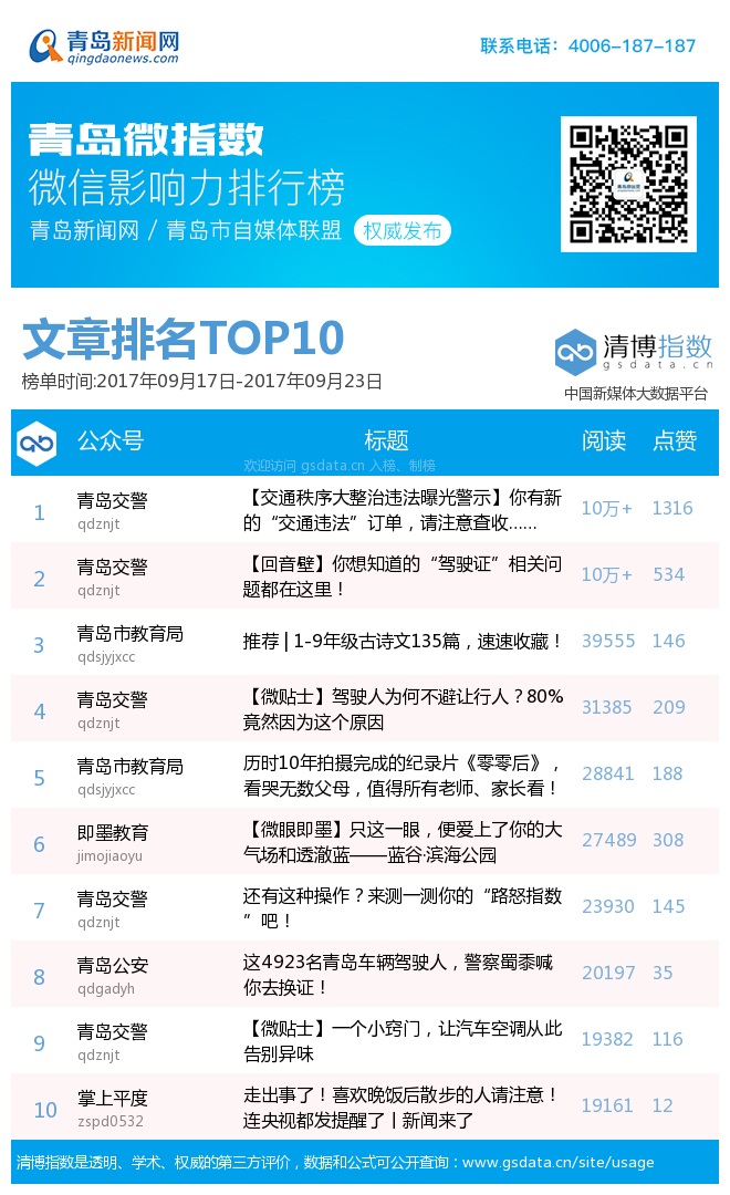 政務(wù)類榜單,“青島交警”經(jīng)過一周的短暫休息,本周集中發(fā)力,一周之內(nèi)連推兩次,以總閱讀31W+,點(diǎn)贊2572次的成績高居政務(wù)類榜首,尤其是發(fā)布的“【回音壁】你想知道的“駕駛證”相關(guān)問題都在這里!”、“【交通秩序大整治違法曝光警示】你有新的“交通違法”訂單,請注意查收……”兩篇推文更是篇篇閱讀超10萬+,受到網(wǎng)友一致歡迎。