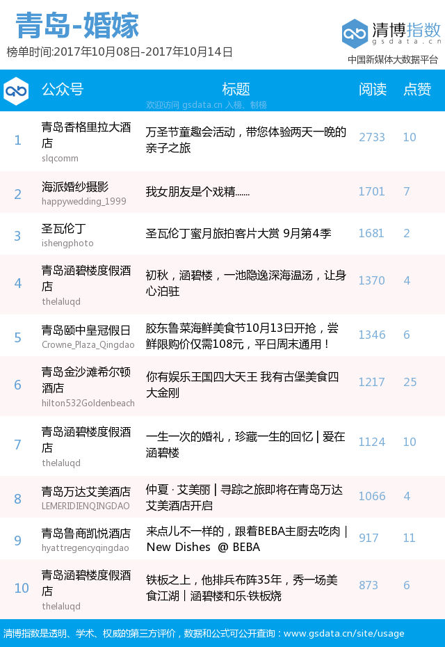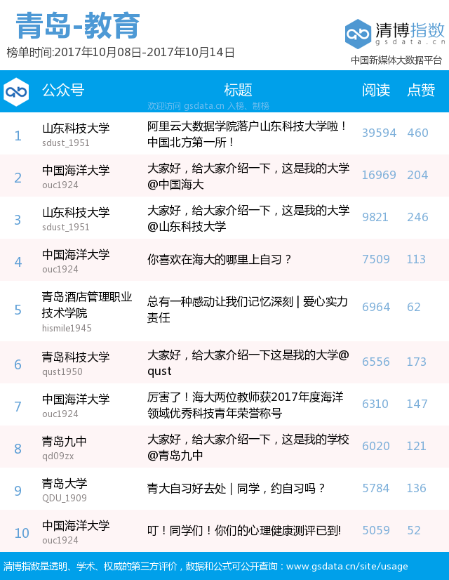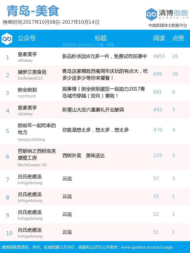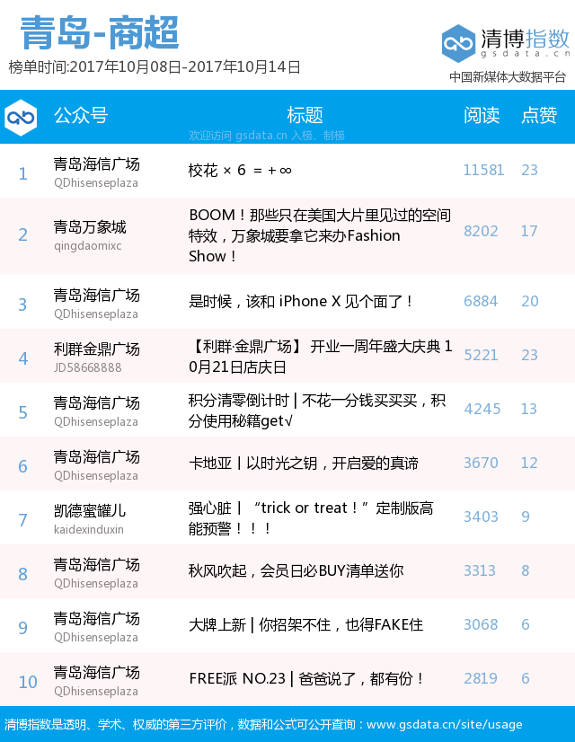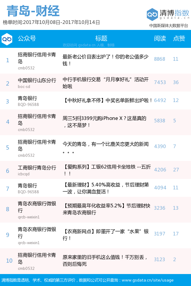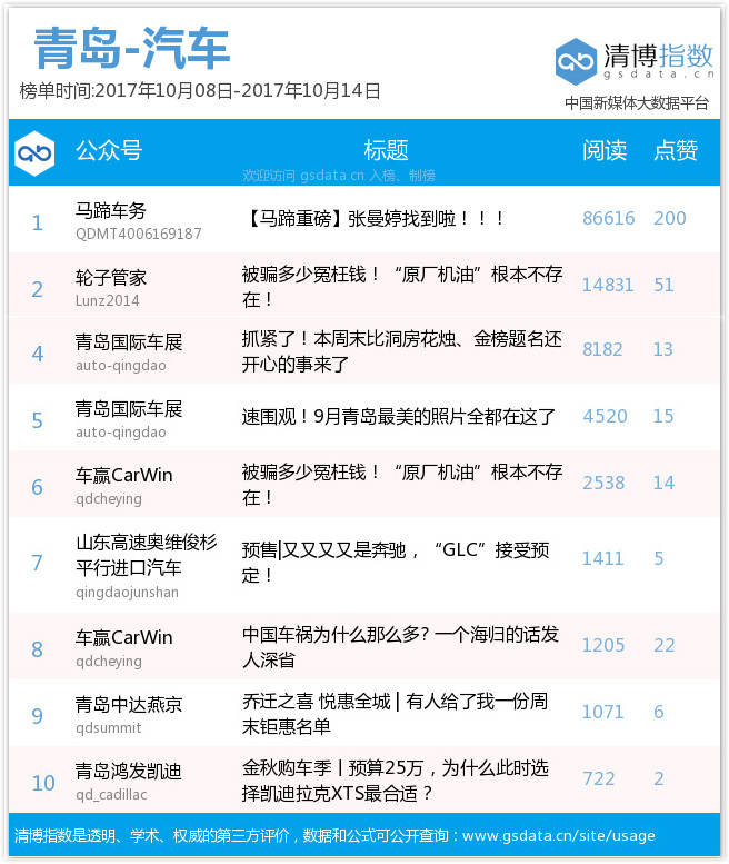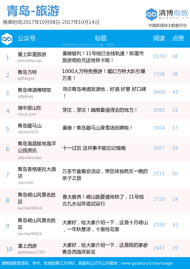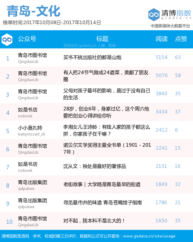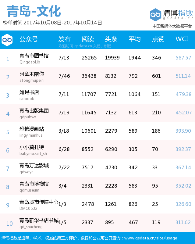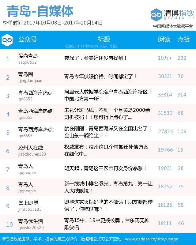 本期青島微指數(shù)微信影響力排行榜是國(guó)慶小長(zhǎng)假后的最新一期,長(zhǎng)假過(guò)后的自媒體人們有沒(méi)有從假期模式中回過(guò)神兒來(lái)?各類(lèi)榜單有沒(méi)有劇烈變動(dòng)?答案是都是肯定的!本期榜單不但排名變化較大,閱讀數(shù)方面更是涌現(xiàn)出眾多10萬(wàn)+的優(yōu)秀文章,究竟是怎么個(gè)情況?小編這就帶你去一看究竟。