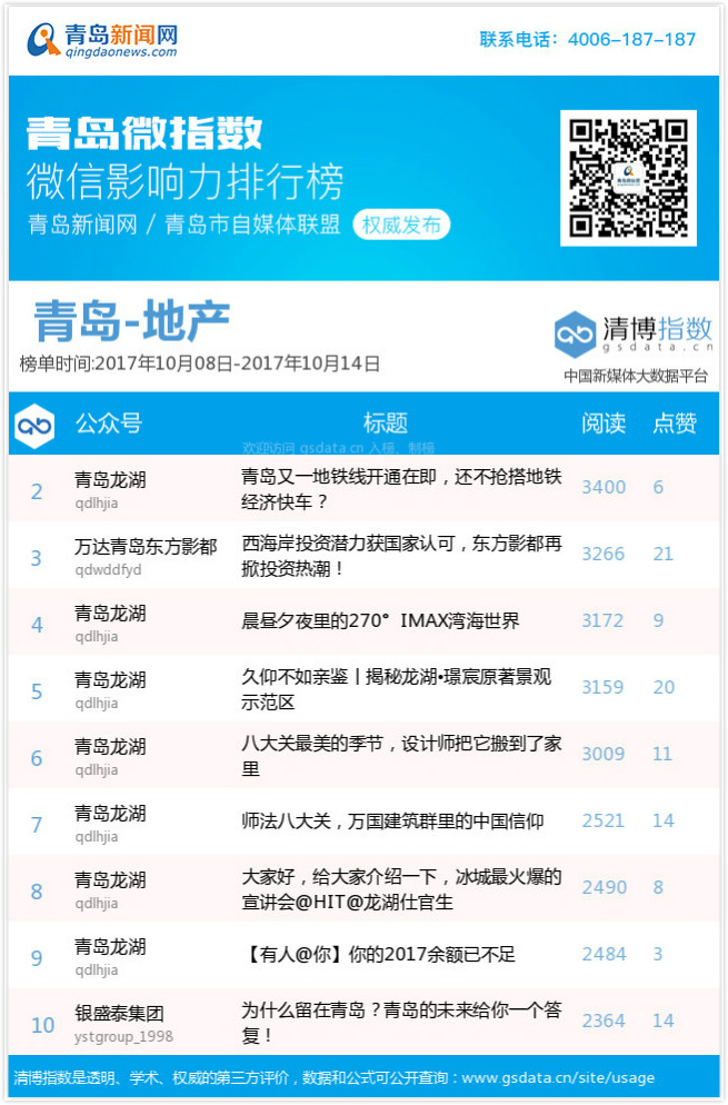 3、本次榜單收錄了青島13個(gè)行業(yè)微信公眾號(hào),如您的賬號(hào)暫未收錄,可聯(lián)系4006-187-187。