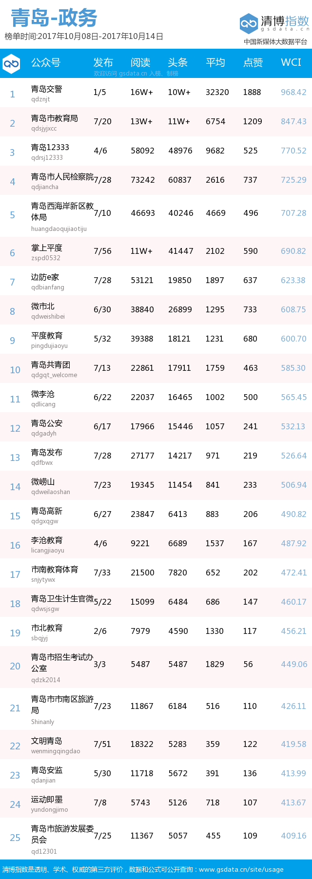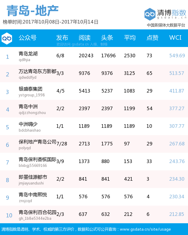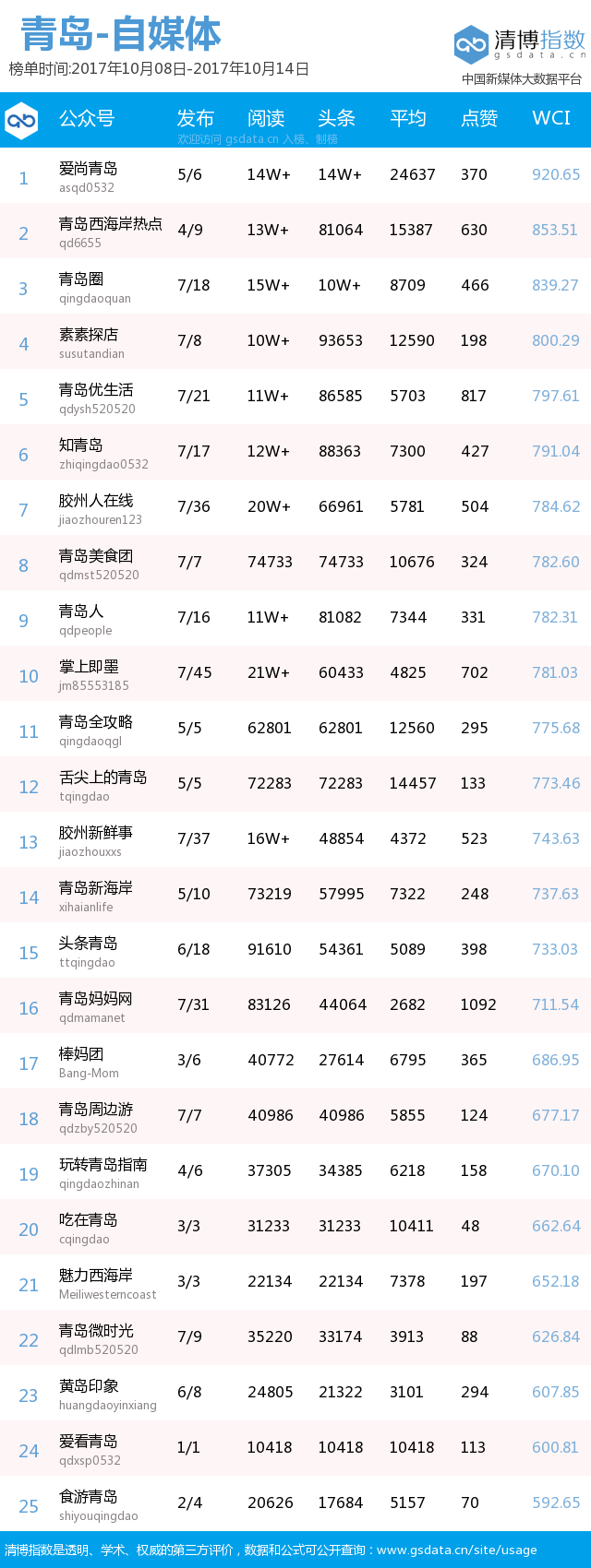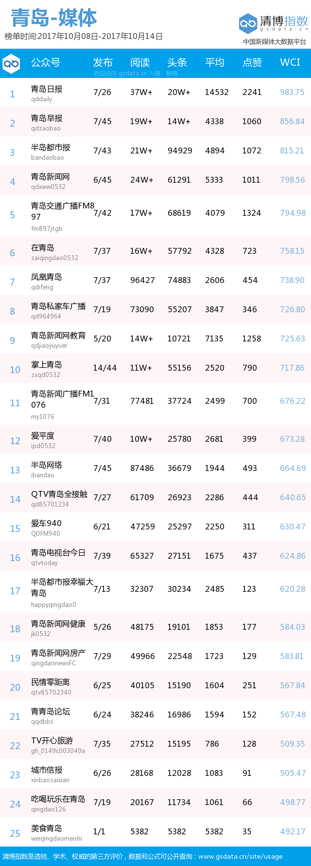 1、“青島微指數(shù)微信影響力排行榜”由青島新聞網(wǎng)微運(yùn)營(yíng)整理發(fā)布。數(shù)據(jù)來(lái)自清博指數(shù)。更多信息請(qǐng)關(guān)注。