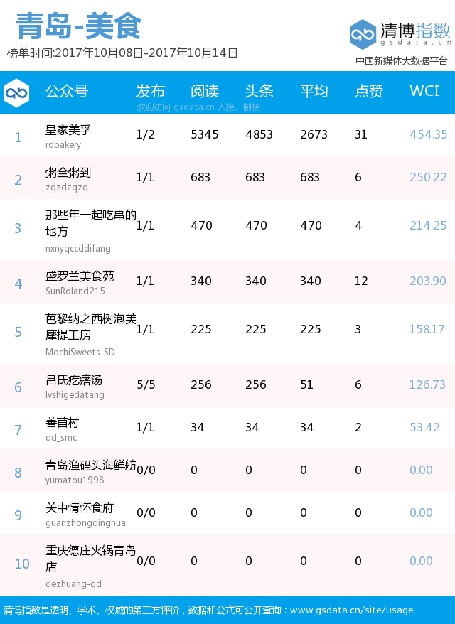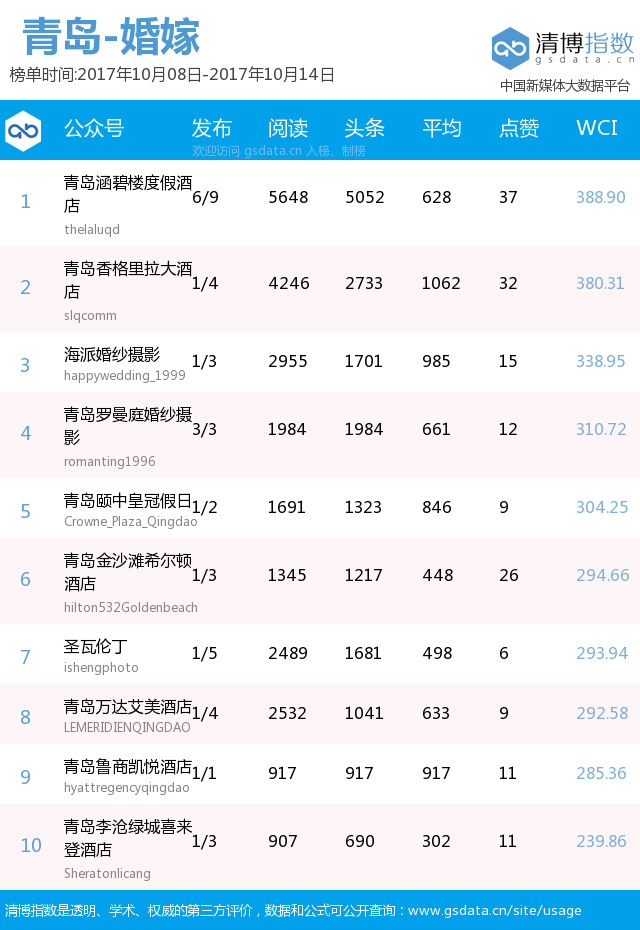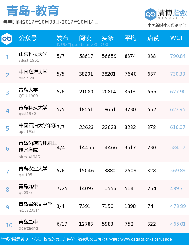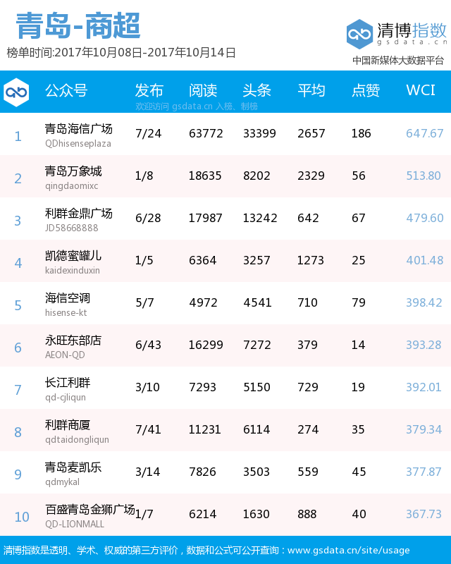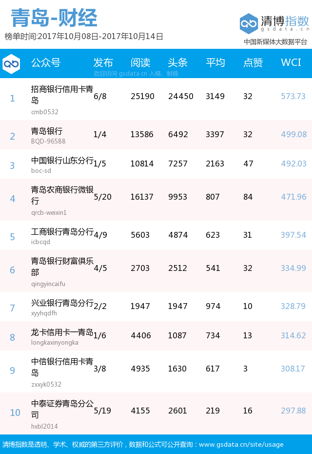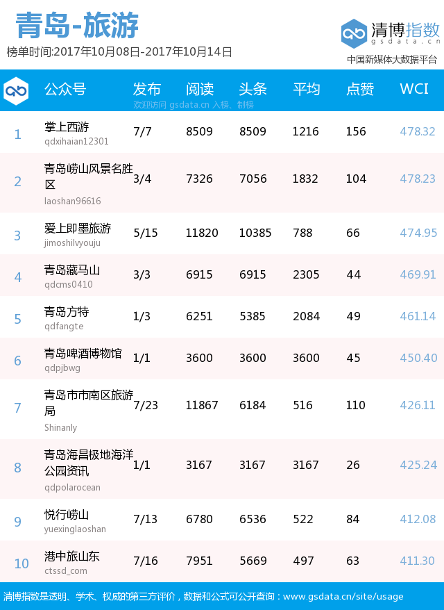 1、“青島微指數(shù)微信影響力排行榜”由青島新聞網(wǎng)微運(yùn)營(yíng)整理發(fā)布。數(shù)據(jù)來(lái)自清博指數(shù)。更多信息請(qǐng)關(guān)注。