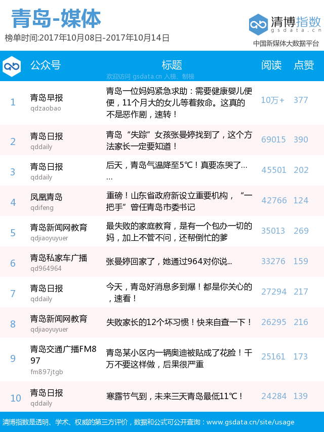 媒體類(lèi)榜單前三名分別由“青島日?qǐng)?bào)”、“青島早報(bào)”、“半島都市報(bào)”奪得,其中“青島早報(bào)”發(fā)布的“青島一位媽媽緊急求助:需要健康嬰兒便便,11個(gè)月大的女兒等著救命。這真的不是惡作劇,速轉(zhuǎn)!”閱讀數(shù)10萬(wàn)+,引發(fā)網(wǎng)友廣泛關(guān)注,高居媒體類(lèi)文章TOP10榜首。