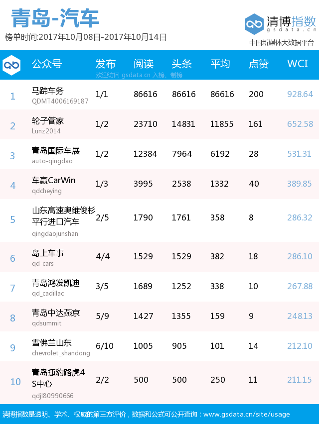 由青島新聞網(wǎng)聯(lián)合清博指數(shù)平臺(tái)聯(lián)手打造的“青島微指數(shù)微信影響力排行榜”,通過(guò)對(duì)各行業(yè)微信公眾號(hào)的日常監(jiān)測(cè),對(duì)所有賬號(hào)在統(tǒng)計(jì)周期內(nèi)所發(fā)布內(nèi)容的發(fā)文總數(shù)、總閱讀數(shù)、頭條閱讀數(shù)、平均閱讀數(shù)及總點(diǎn)贊數(shù)等海量數(shù)據(jù)進(jìn)行分析,幫助各行業(yè)新媒體小編更好地運(yùn)營(yíng)微信。