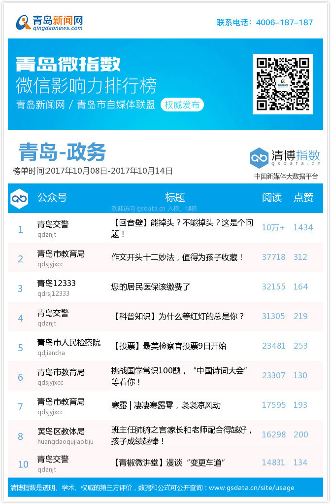 本周政務(wù)類(lèi)榜單前三名變化不可謂不大,分別由“青島交警”、“青島市教育局”、“青島12333”奪得。其中“青島交警”由上周未入榜到一躍奪魁,真正是不鳴則已,一鳴驚人,其中“【回音壁】能掉頭?不能掉頭?這是個(gè)問(wèn)題!”收獲10萬(wàn)+閱讀。青島交警奪得本期進(jìn)步最快獎(jiǎng);同樣進(jìn)步神速的還有“青島12333”,其憑借系列優(yōu)質(zhì)便民類(lèi)信息,收獲了可觀閱讀數(shù)和點(diǎn)贊數(shù),由上周的第13名躍居本期政務(wù)類(lèi)第3名,獲得本期進(jìn)步最快獎(jiǎng)。