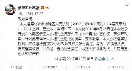 林志穎方面迅速回應(yīng)表示道歉。根據(jù)判決結(jié)果,林志穎共需賠償34.5萬(wàn)元,并在新浪微博置頂致歉聲明72小時(shí)。