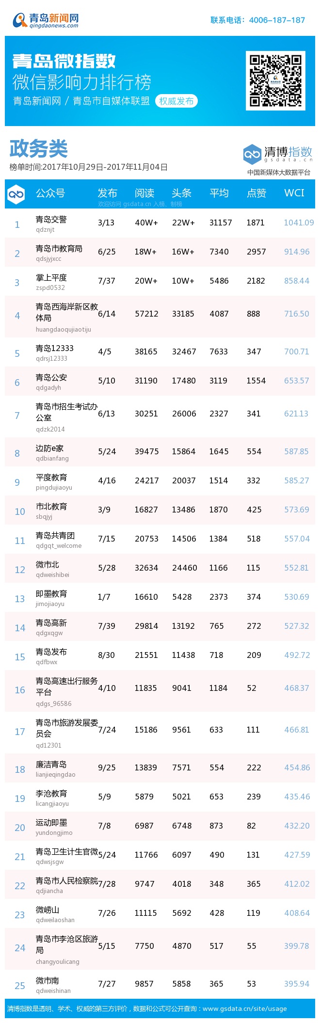 由青島新聞網(wǎng)聯(lián)合清博指數(shù)平臺(tái)聯(lián)手打造的“青島微指數(shù)微信影響力排行榜”,通過對(duì)各行業(yè)微信公眾號(hào)的日常監(jiān)測(cè),對(duì)所有賬號(hào)在統(tǒng)計(jì)周期內(nèi)所發(fā)布內(nèi)容的發(fā)文總數(shù)、總閱讀數(shù)、頭條閱讀數(shù)、平均閱讀數(shù)及總點(diǎn)贊數(shù)等海量數(shù)據(jù)進(jìn)行分析,幫助各行業(yè)新媒體小編更好地運(yùn)營微信。