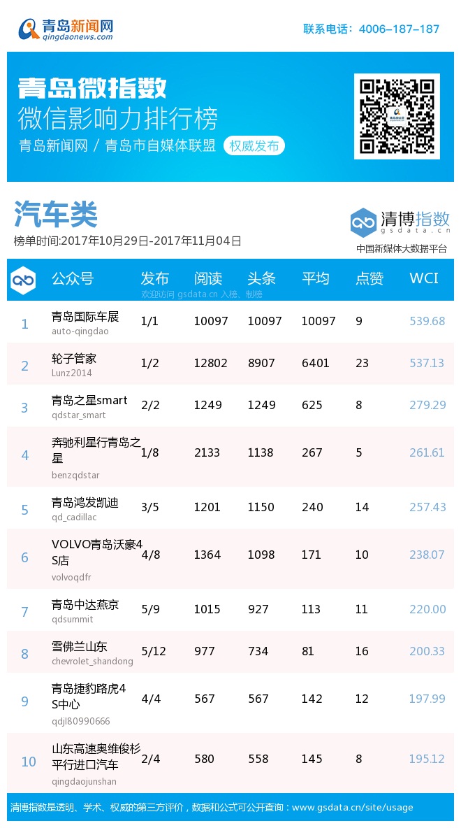 由青島新聞網(wǎng)聯(lián)合清博指數(shù)平臺(tái)聯(lián)手打造的“青島微指數(shù)微信影響力排行榜”,通過(guò)對(duì)各行業(yè)微信公眾號(hào)的日常監(jiān)測(cè),對(duì)所有賬號(hào)在統(tǒng)計(jì)周期內(nèi)所發(fā)布內(nèi)容的發(fā)文總數(shù)、總閱讀數(shù)、頭條閱讀數(shù)、平均閱讀數(shù)及總點(diǎn)贊數(shù)等海量數(shù)據(jù)進(jìn)行分析,幫助各行業(yè)新媒體小編更好地運(yùn)營(yíng)微信。