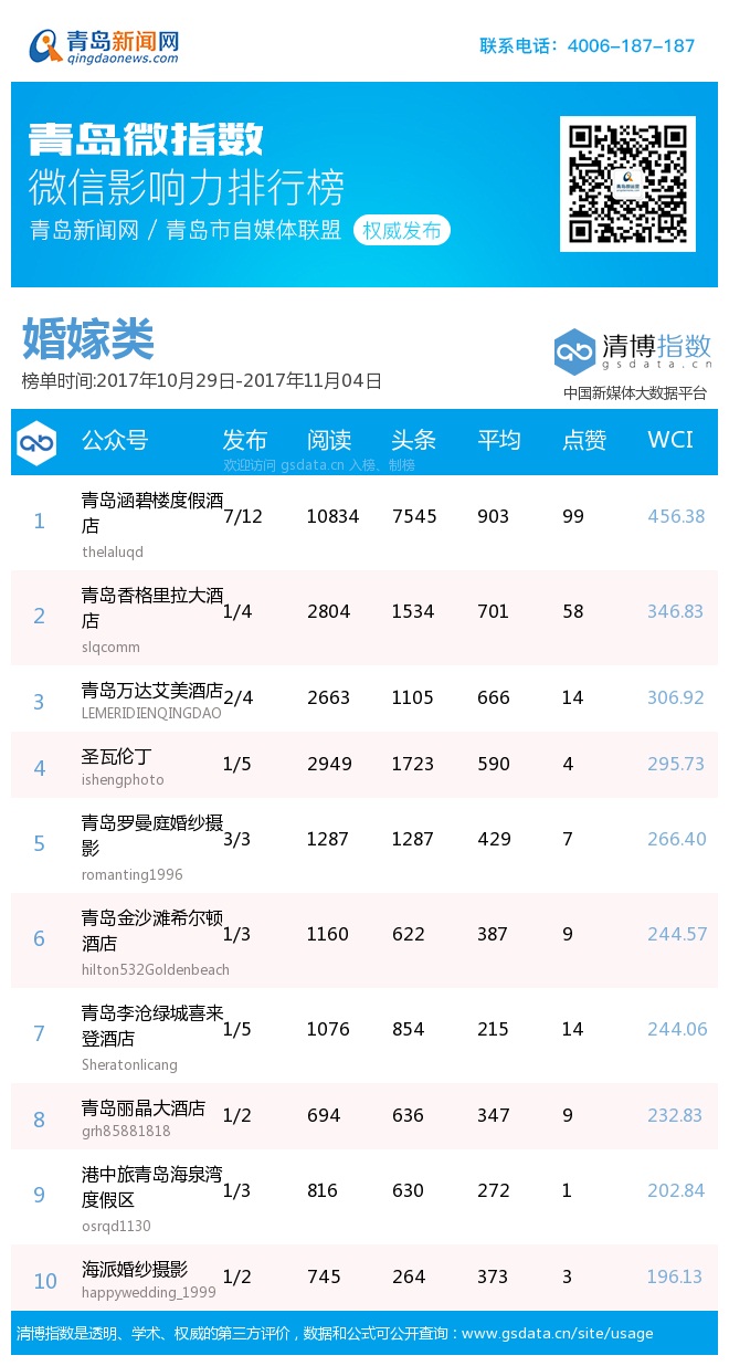 由青島新聞網(wǎng)聯(lián)合清博指數(shù)平臺(tái)聯(lián)手打造的“青島微指數(shù)微信影響力排行榜”,通過(guò)對(duì)各行業(yè)微信公眾號(hào)的日常監(jiān)測(cè),對(duì)所有賬號(hào)在統(tǒng)計(jì)周期內(nèi)所發(fā)布內(nèi)容的發(fā)文總數(shù)、總閱讀數(shù)、頭條閱讀數(shù)、平均閱讀數(shù)及總點(diǎn)贊數(shù)等海量數(shù)據(jù)進(jìn)行分析,幫助各行業(yè)新媒體小編更好地運(yùn)營(yíng)微信。