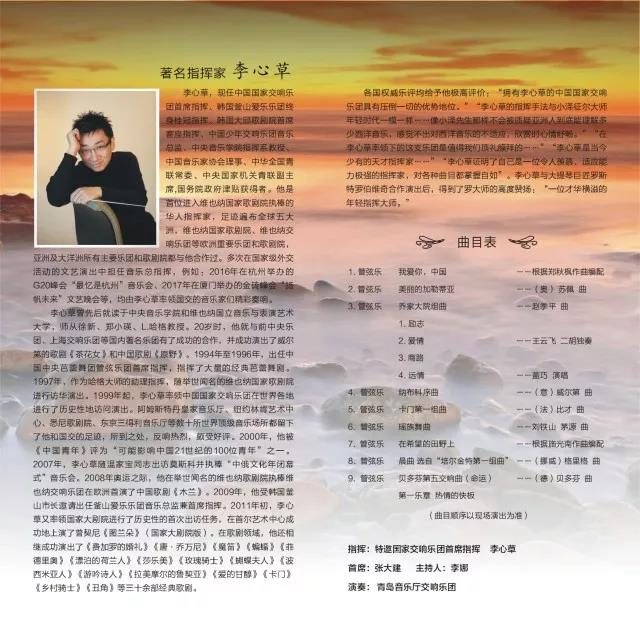 據(jù)了解,本次“盛世之韻”音樂會,將在11月17日19:30即將在青島市音樂廳(蘭山路1號)拉開帷幕,屆時李心草將攜手青島音樂廳交響樂團(tuán)為大家演奏《我愛你中國》、《在希望的田野上》、《喬家大院》等百姓耳熟能詳?shù)膫鹘y(tǒng)國樂,讓交響樂貼近大眾、貼近生活,通過歌頌偉大祖國的壯闊美麗,鼓舞全市人民保持建設(shè)時尚幸?,F(xiàn)代化國際城區(qū)激情和昂揚(yáng)斗志。