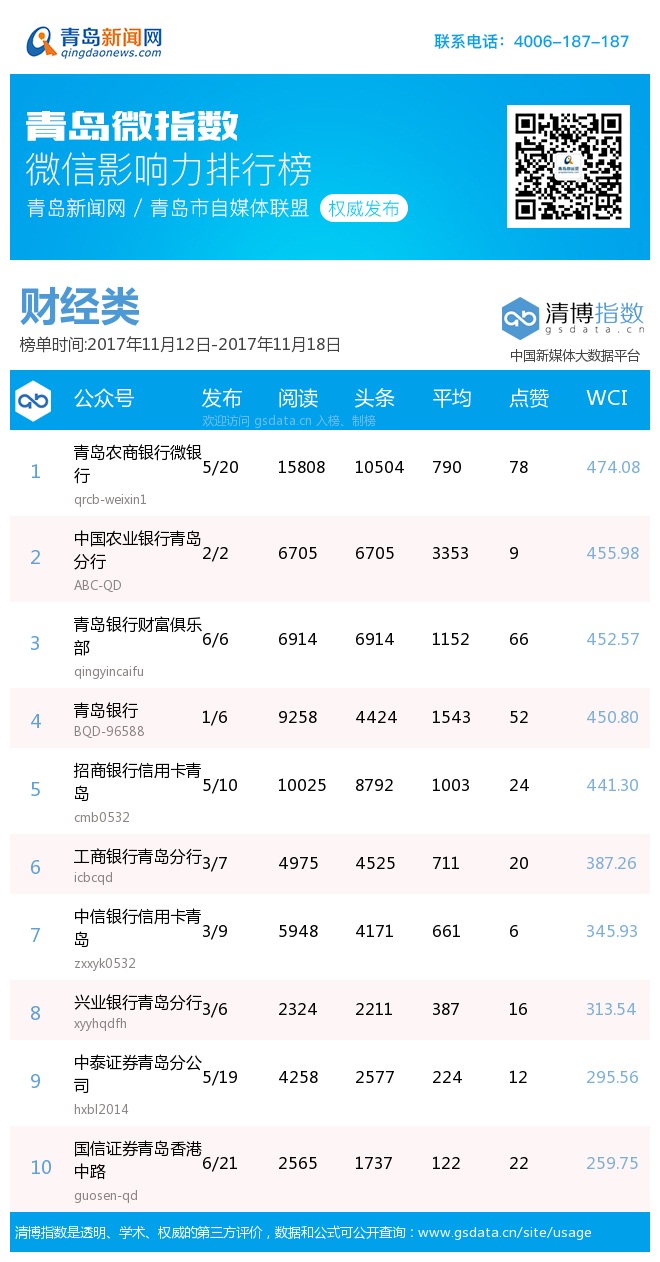 由青島新聞網(wǎng)聯(lián)合清博指數(shù)平臺聯(lián)手打造的“青島微指數(shù)微信影響力排行榜”,通過對各行業(yè)微信公眾號的日常監(jiān)測,對所有賬號在統(tǒng)計周期內(nèi)所發(fā)布內(nèi)容的發(fā)文總數(shù)、總閱讀數(shù)、頭條閱讀數(shù)、平均閱讀數(shù)及總點贊數(shù)等海量數(shù)據(jù)進行分析,幫助各行業(yè)新媒體小編更好地運營微信。