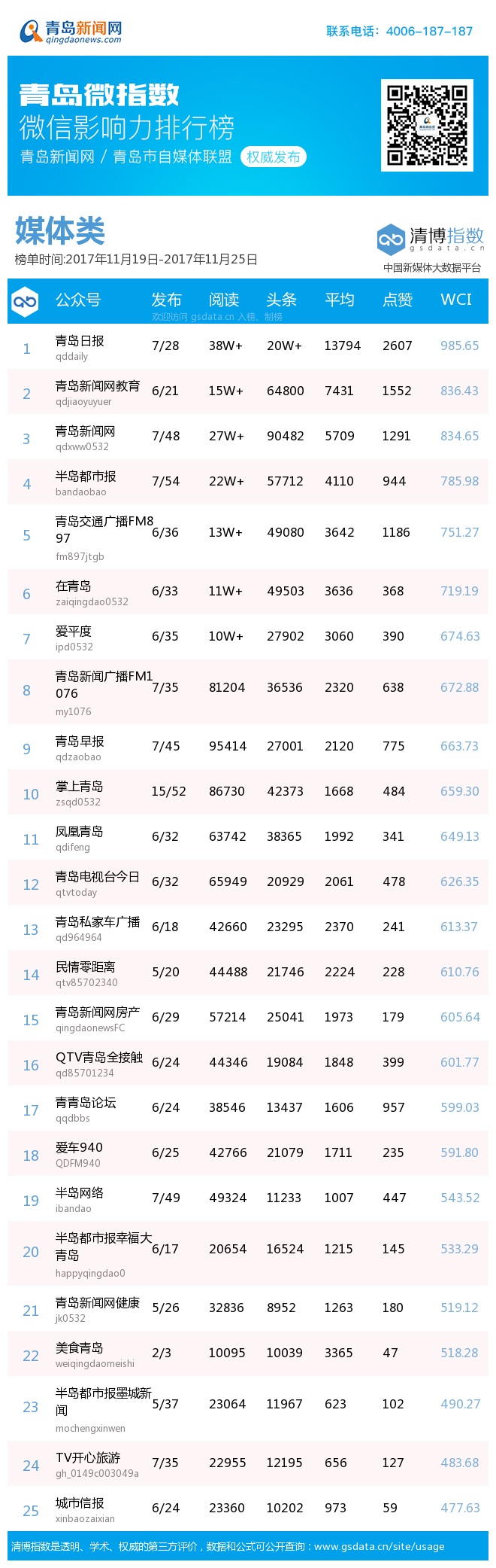 由青島新聞網(wǎng)聯(lián)合清博指數(shù)平臺(tái)聯(lián)手打造的“青島微指數(shù)微信影響力排行榜”,通過對(duì)各行業(yè)微信公眾號(hào)的日常監(jiān)測(cè),對(duì)所有賬號(hào)在統(tǒng)計(jì)周期內(nèi)所發(fā)布內(nèi)容的發(fā)文總數(shù)、總閱讀數(shù)、頭條閱讀數(shù)、平均閱讀數(shù)及總點(diǎn)贊數(shù)等海量數(shù)據(jù)進(jìn)行分析,幫助各行業(yè)新媒體小編更好地運(yùn)營(yíng)微信。