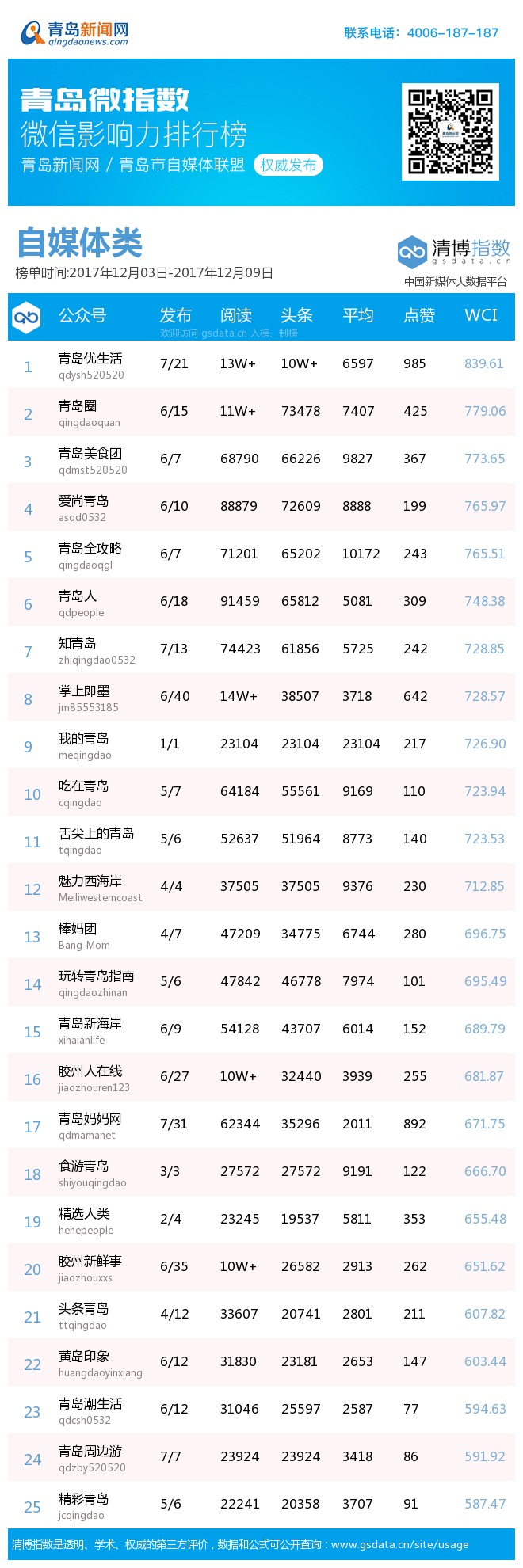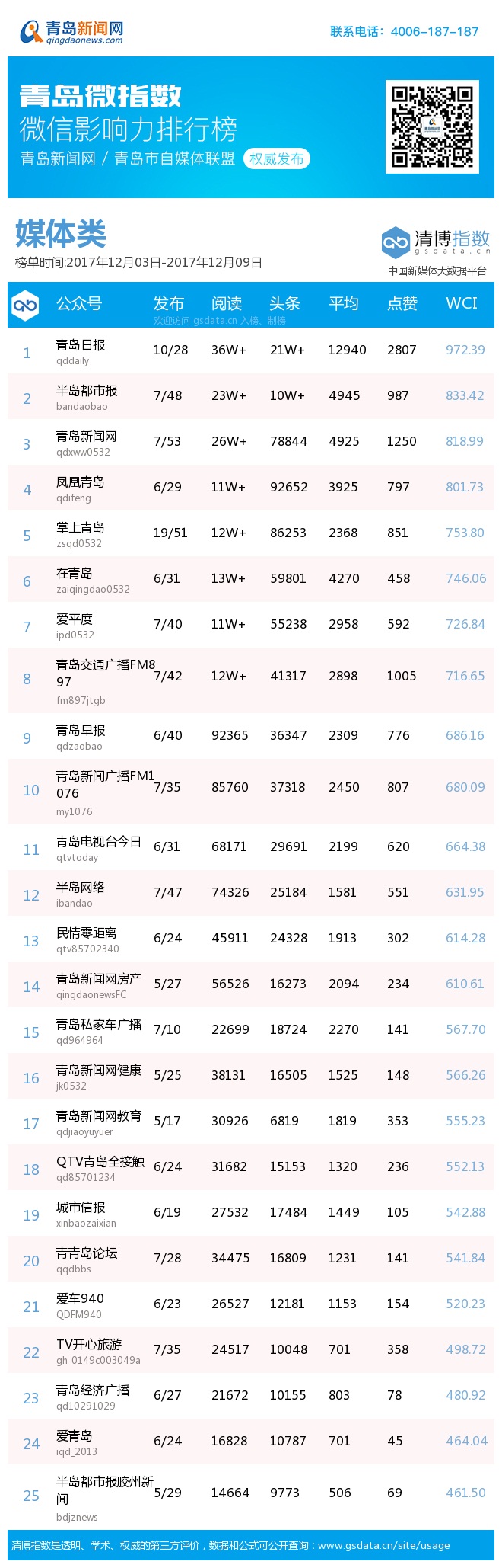1、“青島微指數(shù)微信影響力排行榜”由青島新聞網(wǎng)微運營整理發(fā)布。數(shù)據(jù)來自清博指數(shù)。更多信息請關注。