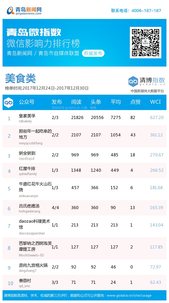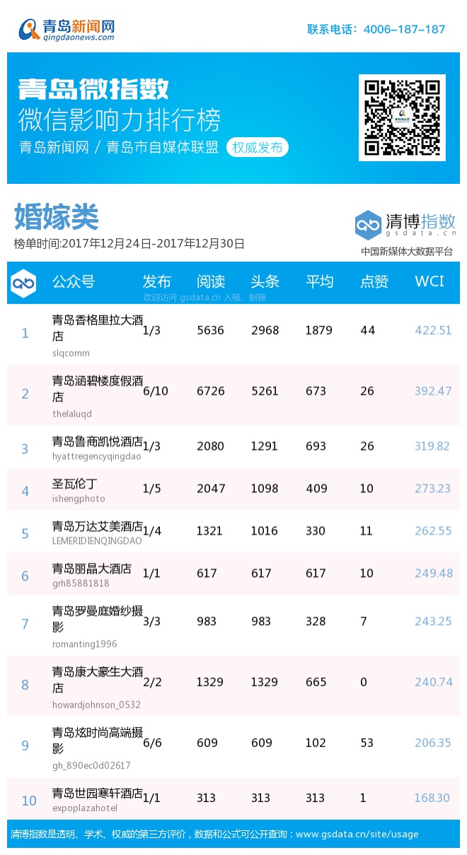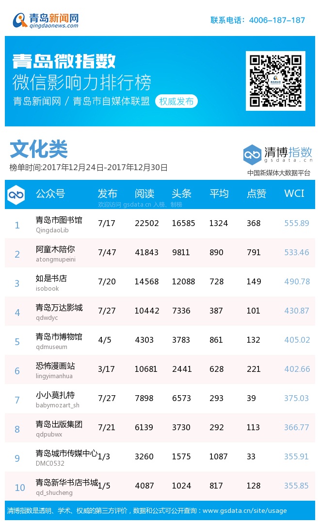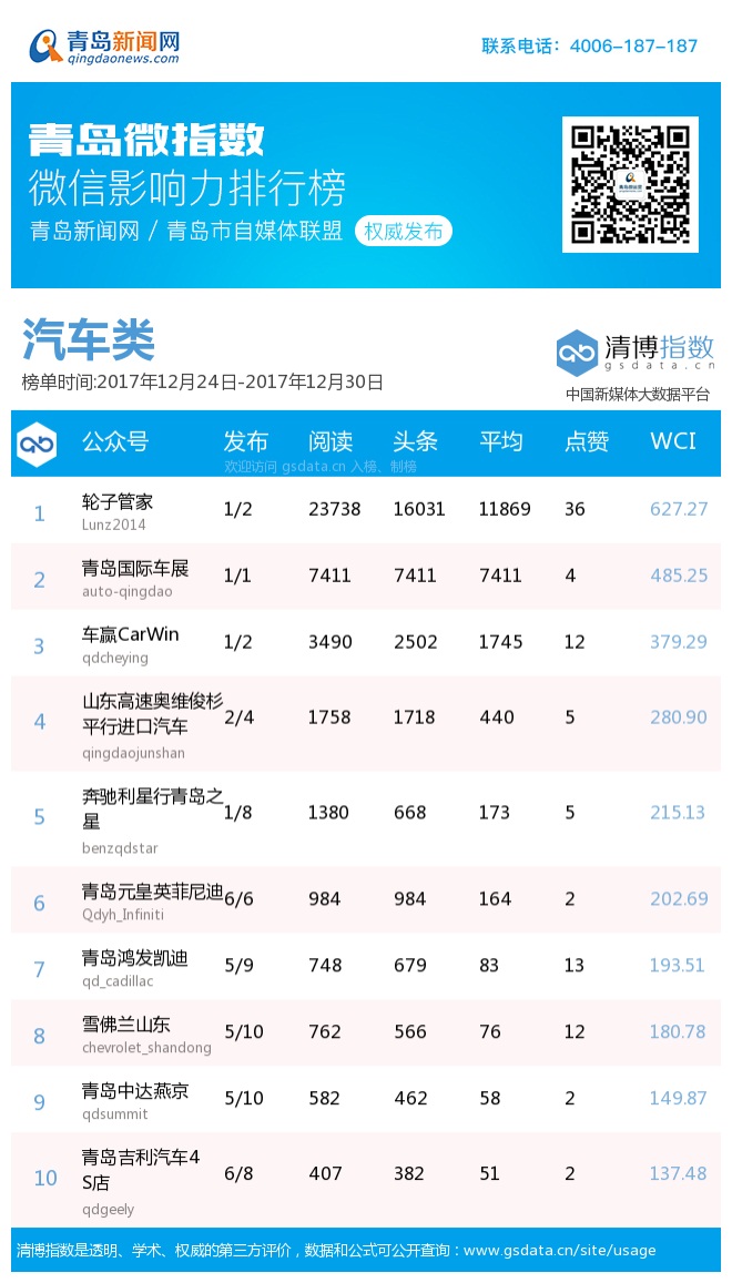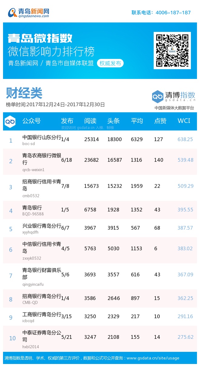 3、本次榜單收錄了青島13個(gè)行業(yè)微信公眾號(hào),如您的賬號(hào)暫未收錄,可聯(lián)系4006-187-187。