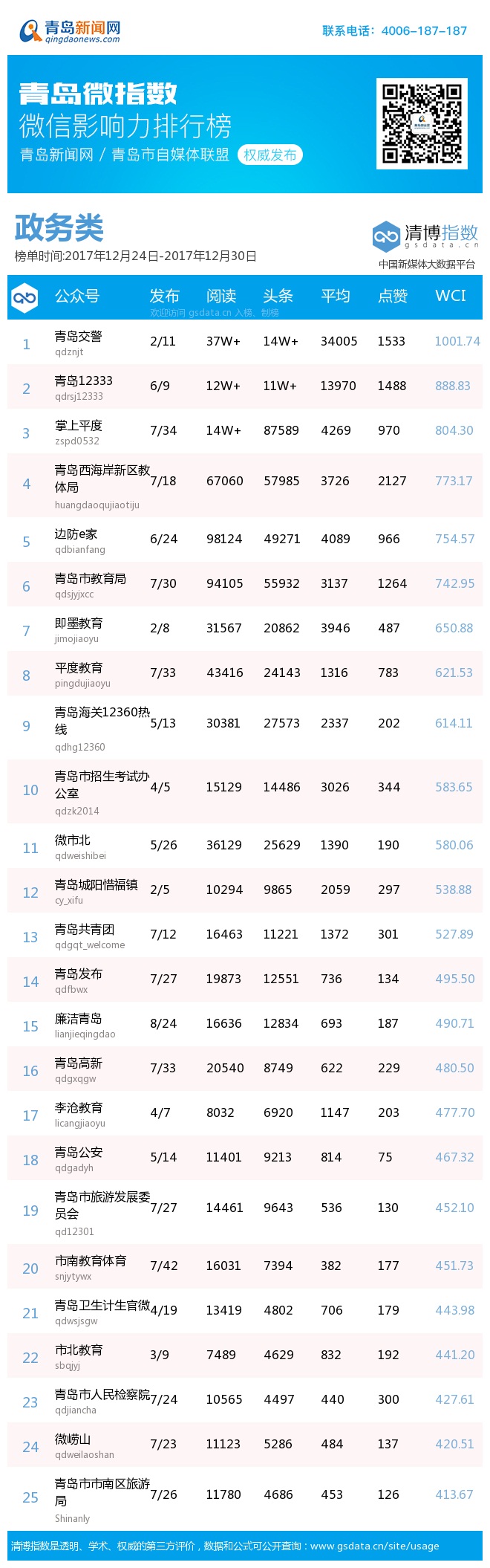 政務(wù)類榜單前三名分別由“青島交警”、“青島12333”、“掌上平度”奪得,其中“青島交警”連發(fā)的“【青椒微講堂】交通事故發(fā)生后,如何讓交警快速到場(chǎng)?”、“2018年元旦假期交通安全出行服務(wù)提示”、“青島市這8161位駕駛?cè)苏?qǐng)速速點(diǎn)開(kāi)這條微信!”、“【回音壁】辟謠——“2018年1月1日起所有汽車年檢時(shí)均需配備反光背心”?!”四篇實(shí)用性文章,受到車主強(qiáng)烈關(guān)注,霸占政務(wù)類熱文榜前四名,并最終以閱讀37萬(wàn)+,點(diǎn)贊1533次,WCI指數(shù)1001.74的好成績(jī)高居政務(wù)類榜首。