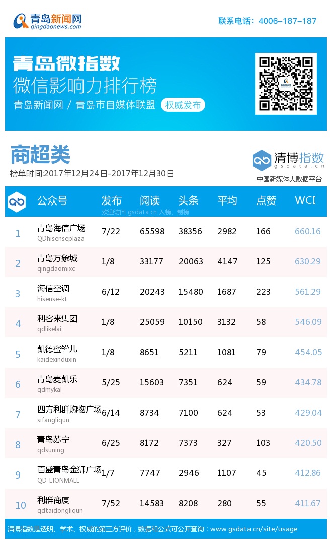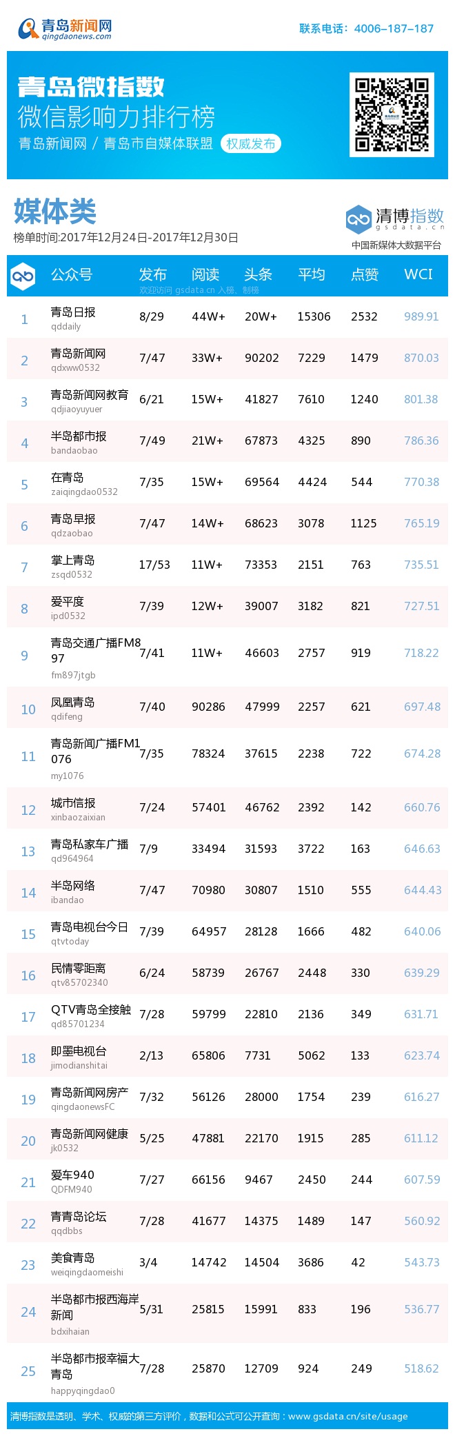 青島新聞網(wǎng)1月1日訊 由青島新聞網(wǎng)聯(lián)合清博指數(shù)平臺(tái)聯(lián)手打造的“青島微指數(shù)微信影響力排行榜”今日發(fā)布一周(12.24—12.30)榜單。作為2017年的最后一個(gè)榜單,各微信官微齊發(fā)力,為2017年畫上一個(gè)圓滿的句號(hào)。其中媒體類榜單中,“青島日?qǐng)?bào)”、“青島新聞網(wǎng)”、“青島新聞網(wǎng)教育”、“半島都市報(bào)”、“在青島”占據(jù)榜單前五名,尤其是青島新聞網(wǎng)旗下微信公眾號(hào)“青島新聞網(wǎng)”、“青島新聞網(wǎng)教育”、“在青島”分別奪得第二名、第三名、第五名,獨(dú)占前五名三個(gè)席位,彰顯了青島新聞網(wǎng)在移動(dòng)端傳播上的強(qiáng)大影響力。