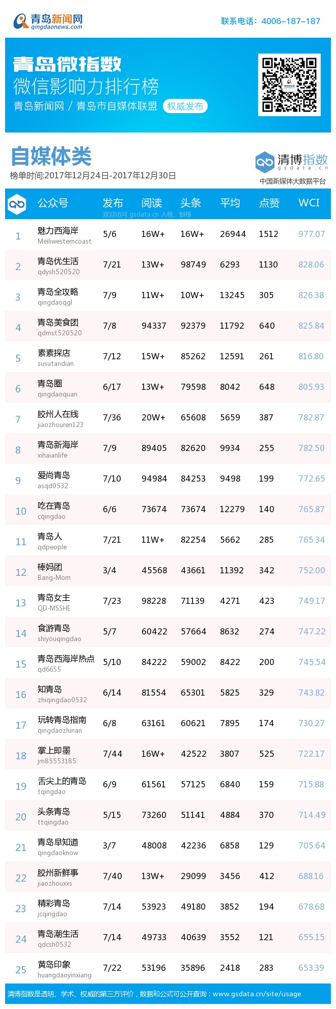 1、“青島微指數(shù)微信影響力排行榜”由青島新聞網(wǎng)微運(yùn)營(yíng)整理發(fā)布。數(shù)據(jù)來(lái)自清博指數(shù)。更多信息請(qǐng)關(guān)注。