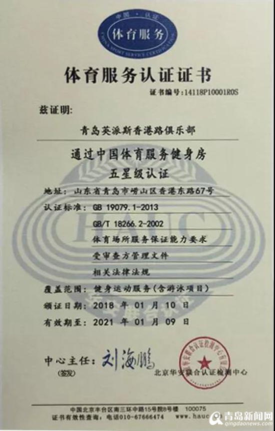 青島新聞網(wǎng)1月17日訊 由國家體育總局和國家認(rèn)證認(rèn)可監(jiān)督管理委員會批準(zhǔn)成立的第三方認(rèn)證機構(gòu)——北京華安聯(lián)合認(rèn)證中心主辦的中國體育服務(wù)認(rèn)證健身房星級評定已正式開始授牌。英派斯健身香港路館成為全國首批五星級體育服務(wù)健身房。