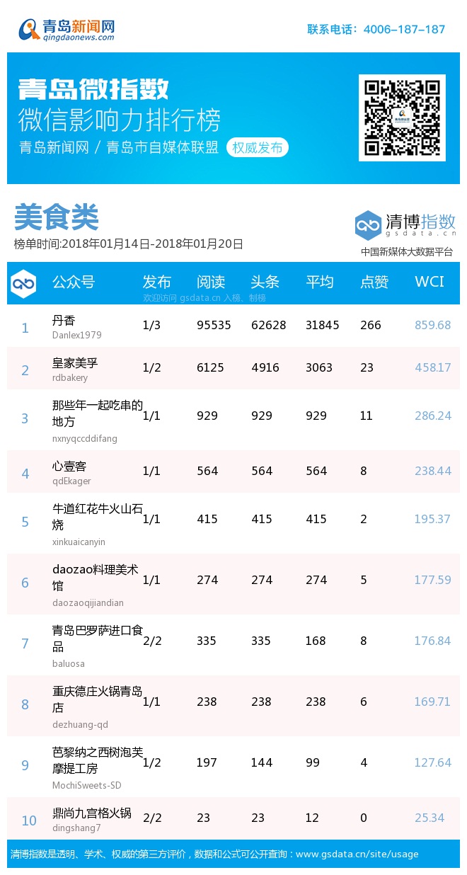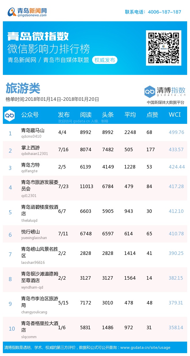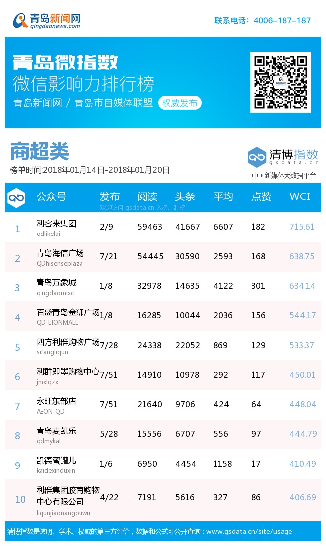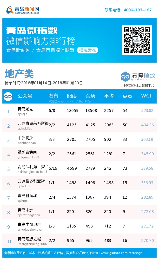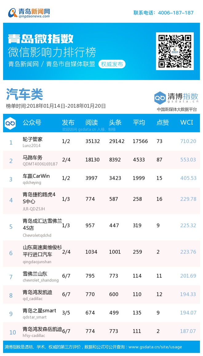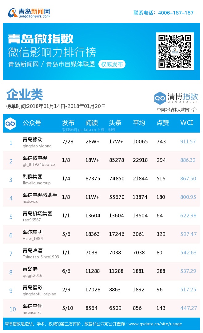 3、本次榜單收錄了青島14個(gè)行業(yè)微信公眾號,如您的賬號暫未收錄,可聯(lián)系4006-187-187。