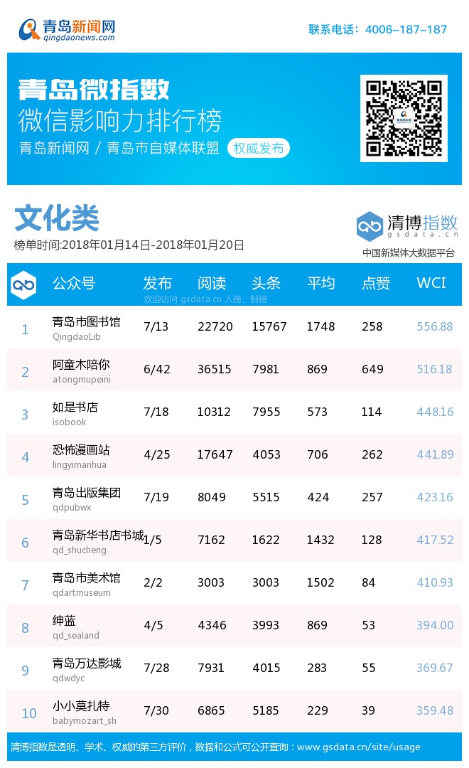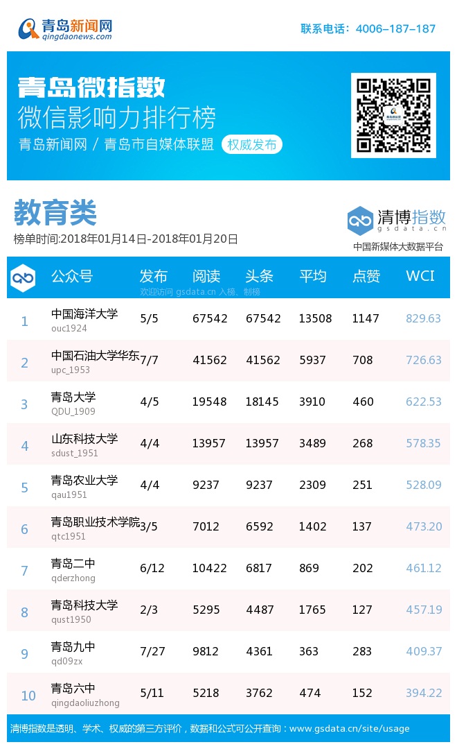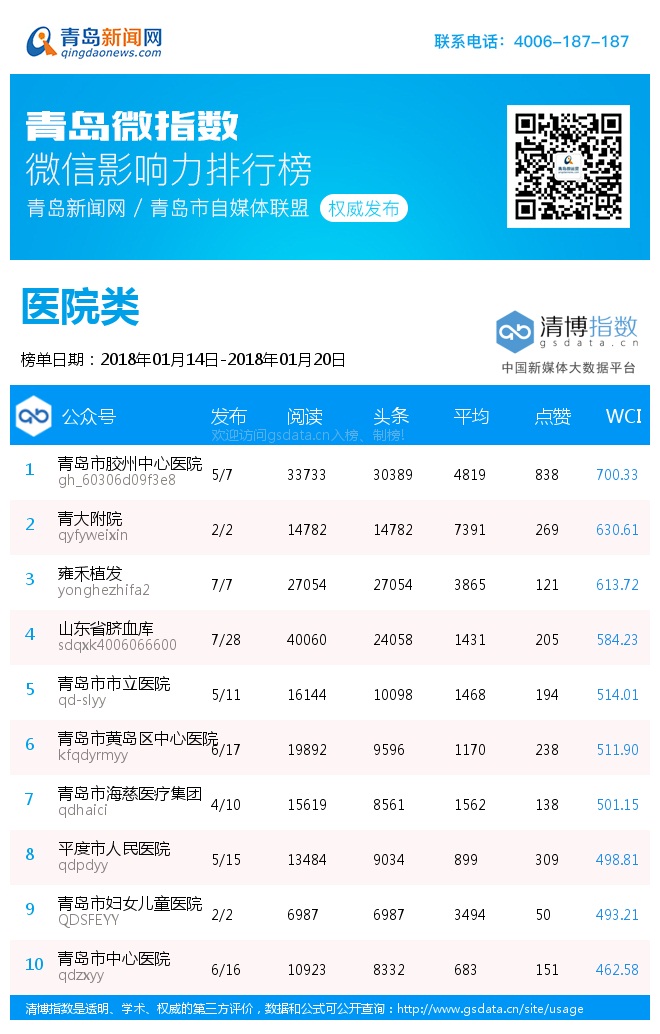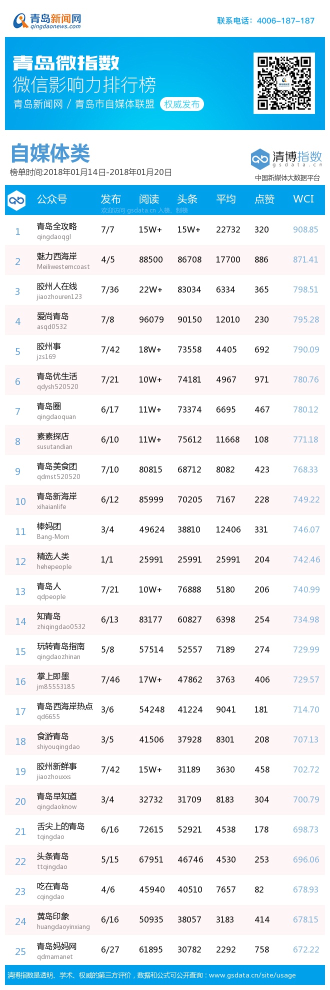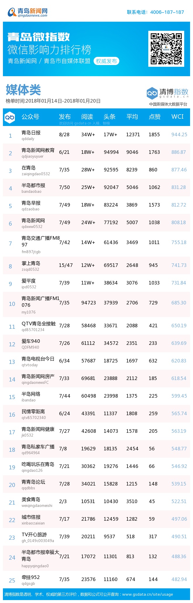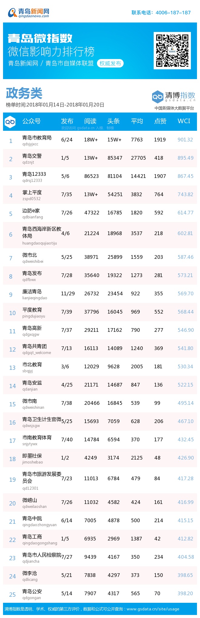 青島新聞網(wǎng)1月22日訊 (記者 邢書玲)由青島新聞網(wǎng)聯(lián)合清博指數(shù)平臺(tái)聯(lián)手打造的“青島微指數(shù)微信影響力排行榜”今日發(fā)布一周(1.14—1.20)榜單。上周是全市中小學(xué)生期末大考的日子,“青島市教育局”在考試期間連發(fā)多篇啟迪性文章,引導(dǎo)學(xué)生、家長以平常心對待考試,最終以總閱讀18萬+,點(diǎn)贊1919次,WCI指數(shù)901.32的成績奪得本周冠軍;“青島交警”緊隨其后,其發(fā)布“【便民服務(wù)】更新‘手機(jī)號碼’的詳細(xì)說明來了~~”一文,用圖表形式詳細(xì)為網(wǎng)友解答了如何“更新手機(jī)號碼”,截至目前該文章閱讀85347次,點(diǎn)贊230次,高居政務(wù)熱文榜第一名。