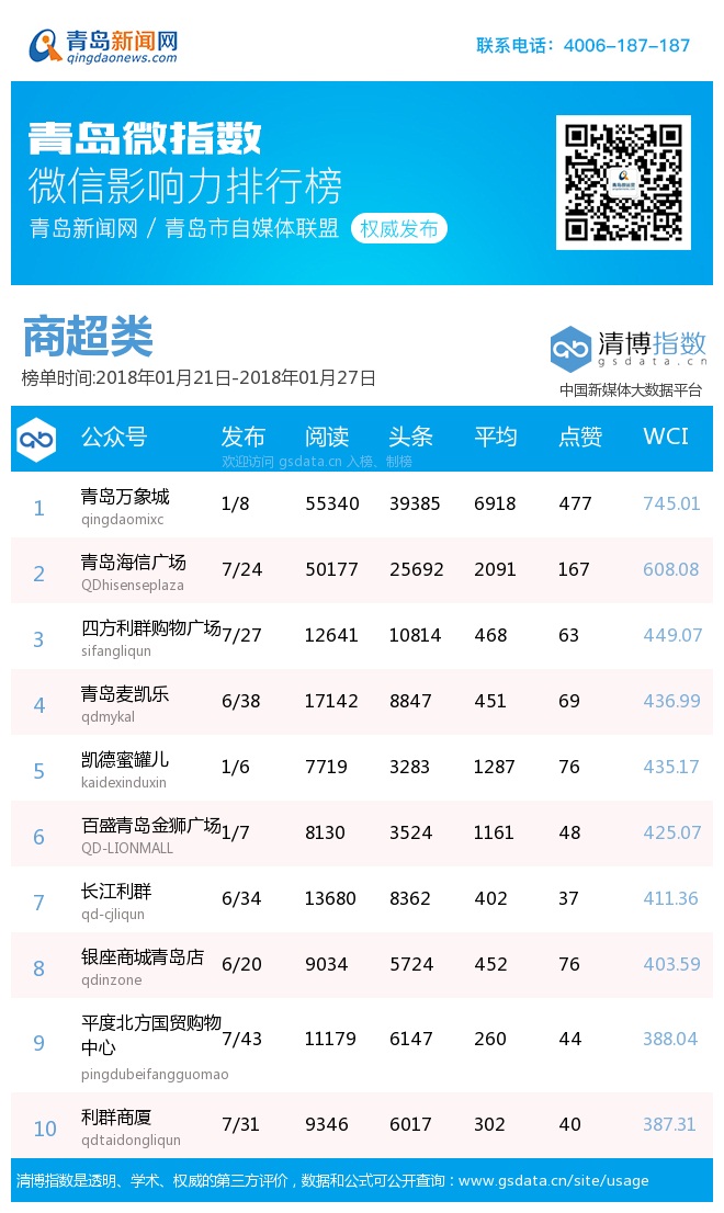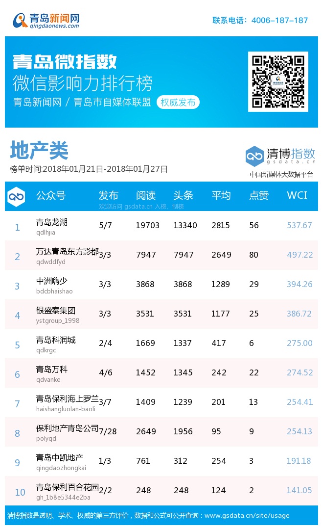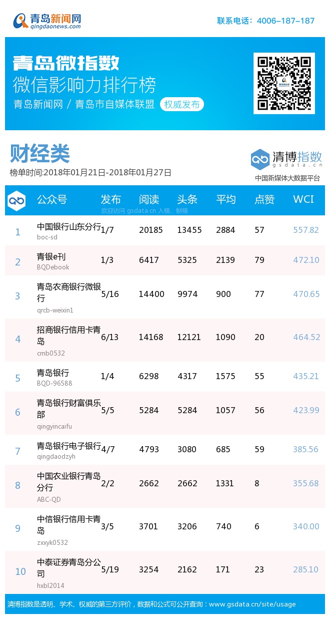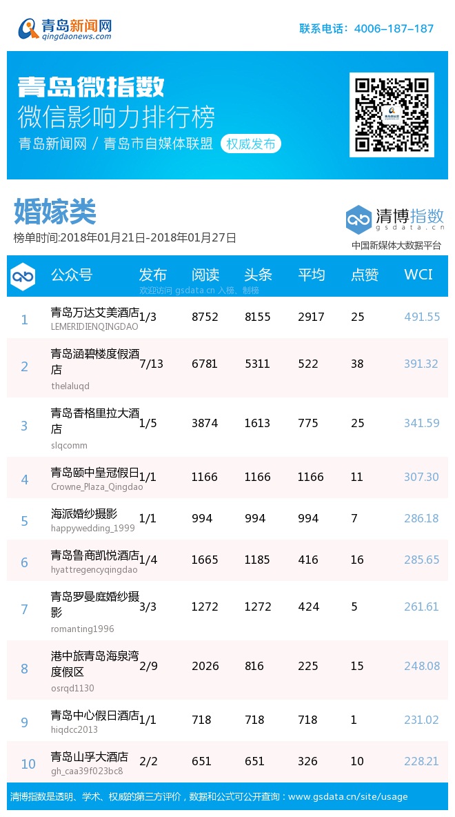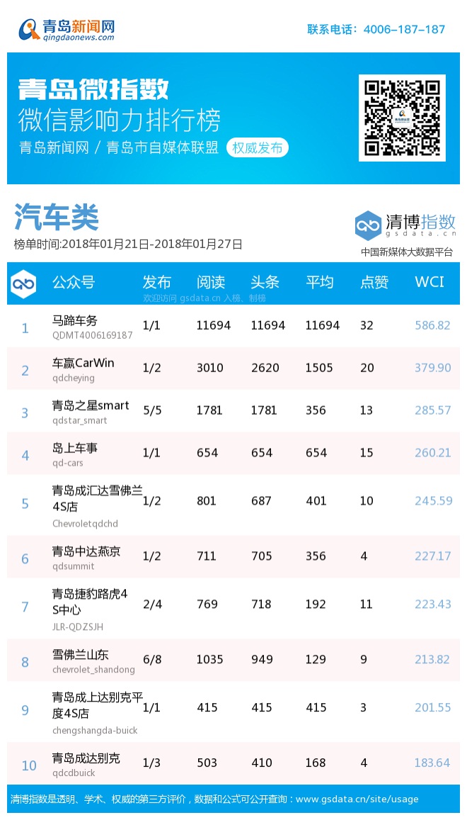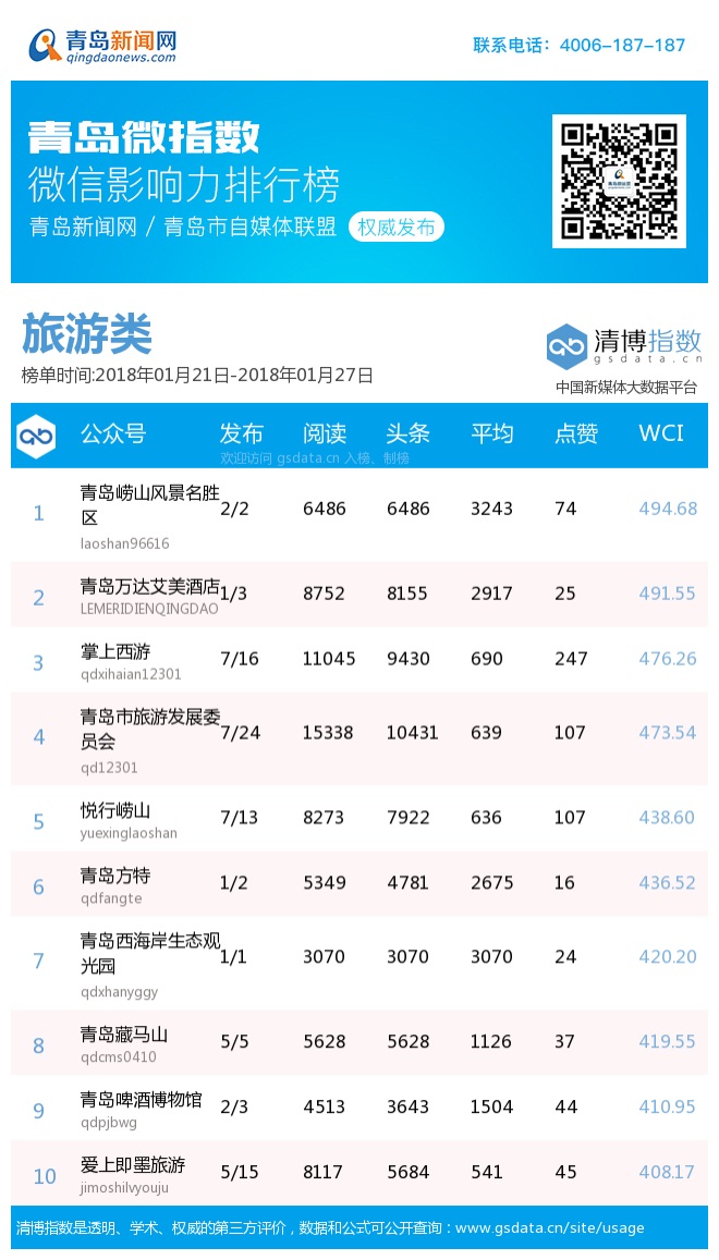 3、本次榜單收錄了青島14個(gè)行業(yè)微信公眾號(hào),如您的賬號(hào)暫未收錄,可聯(lián)系4006-187-187。